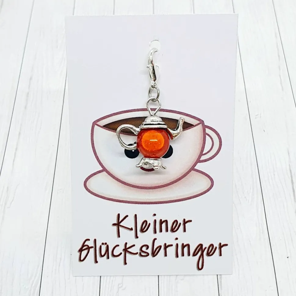 Glücksbringer Kanne silberfarben / orange – der charmante Anhänger für alle Tee- und Kaffeeliebhaber! Ob Tee oder Kaffee, dieses niedliche Kännchen passt einfach zu jedem Heißgetränkfreund und setzt einen besonderen Akzent an Schlüsselbund, Tasche oder Geschenk.