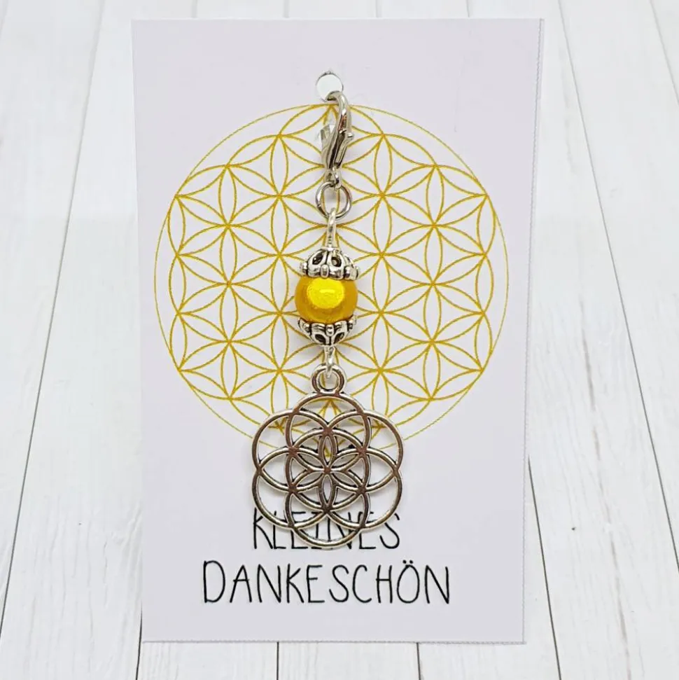 Entdecke den Glücksbringer Same des Lebens – ein wunderschöner Anhänger in silberfarben mit einer auffälligen gelben 3D-Acrylperle. Mit einer Breite von 2cm und einer Gesamtlänge von ca. 4,5cm ohne Karabiner (6cm inkl. Karabiner) ist dieses Schmuckstück das perfekte Accessoire für alle, die sich mit Yoga, Chakren oder spirituellen Symbolen beschäftigen.