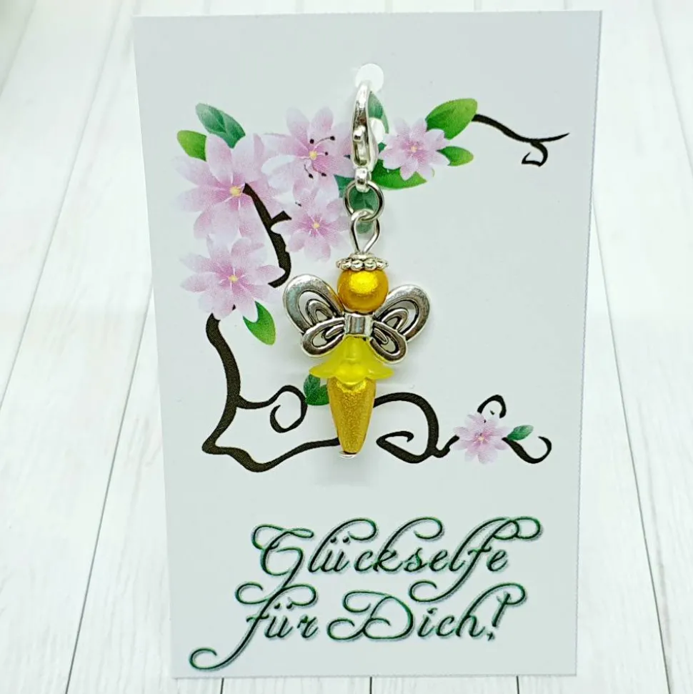 Entdecke die zauberhafte Glücksbringer Schmetterlingselfe silberfarben / gelb – ein einzigartiger Anhänger, der nicht nur durch sein wunderschönes Design, sondern auch durch seine Bedeutung als Glücksbringer begeistert. Diese zarten Geschöpfe stammen aus verwunschenen Wäldern und bringen Dir ganz bestimmt viel Glück!