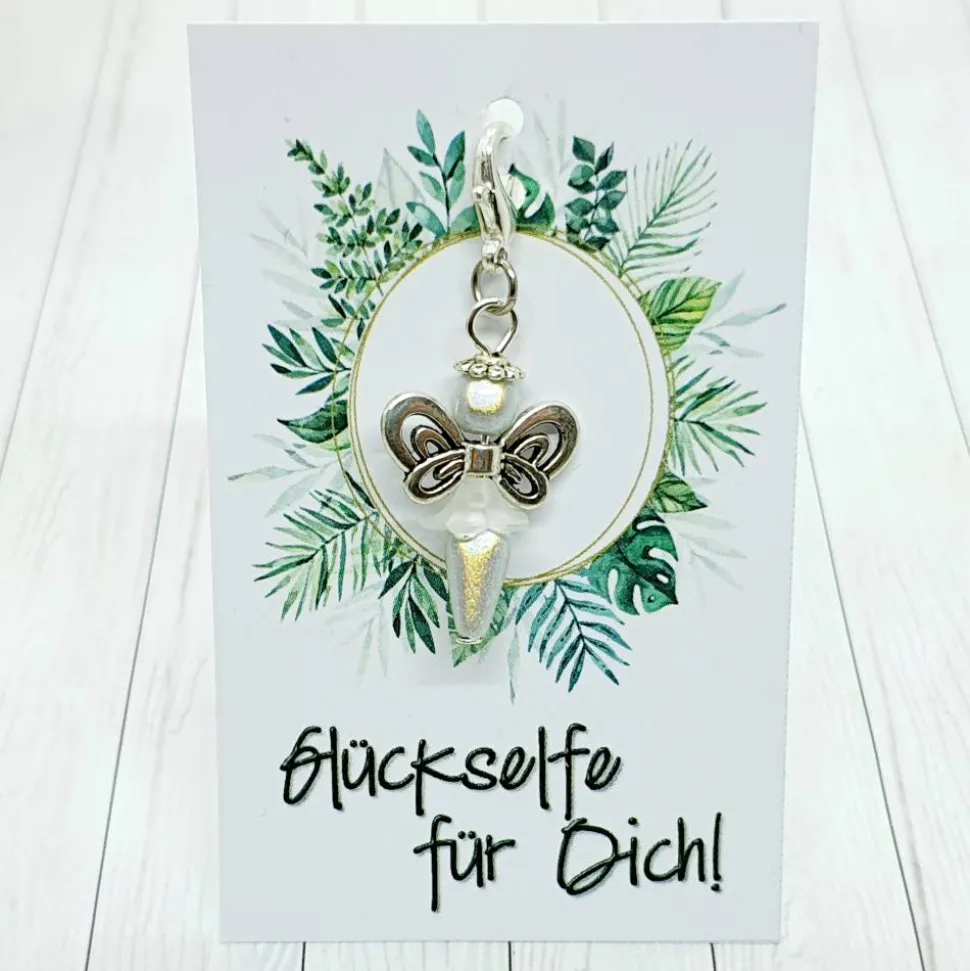 Entdecke die zauberhafte Glücksbringer Schmetterlingselfe in silberfarben/weiß – ein einzigartiger Anhänger, der Dich mit seinem geheimnisvollen Schimmer verzaubert! Diese zarten Geschöpfe stammen aus verwunschenen Wäldern und bringen Dir ganz bestimmt Glück, wenn Du sie bei Dir trägst.
