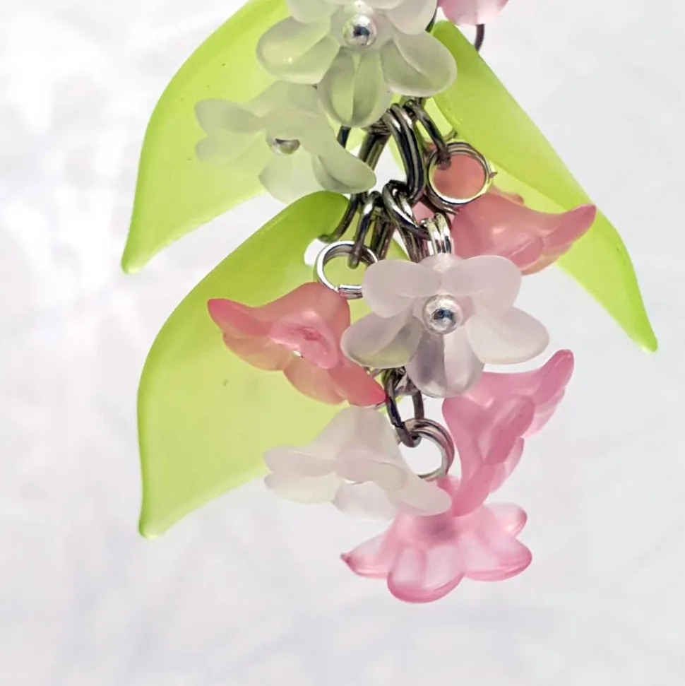 Du erhältst einen verspielten Anhänger mit insgesamt 10 Acrylblüten in zwei verschiedenen Farben sowie drei passenden grünen Blättchen. Alles ist an einem feinen Kettchen mit Karabiner befestigt und peppt garantiert jedes Accessoire auf.