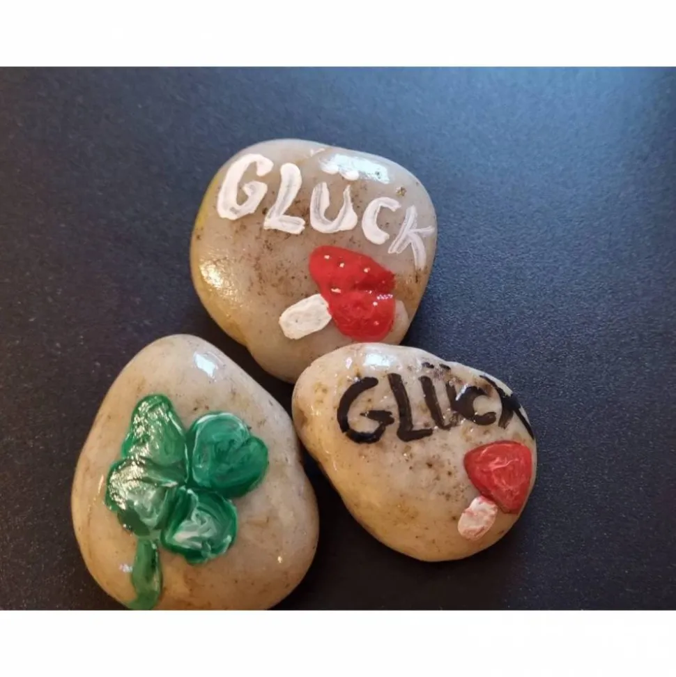 Die Steine sind selbst bemalt und lackiert, sodass jeder Stein auch draußen ein schönes Plätzchen finden kann.