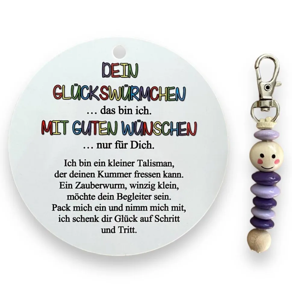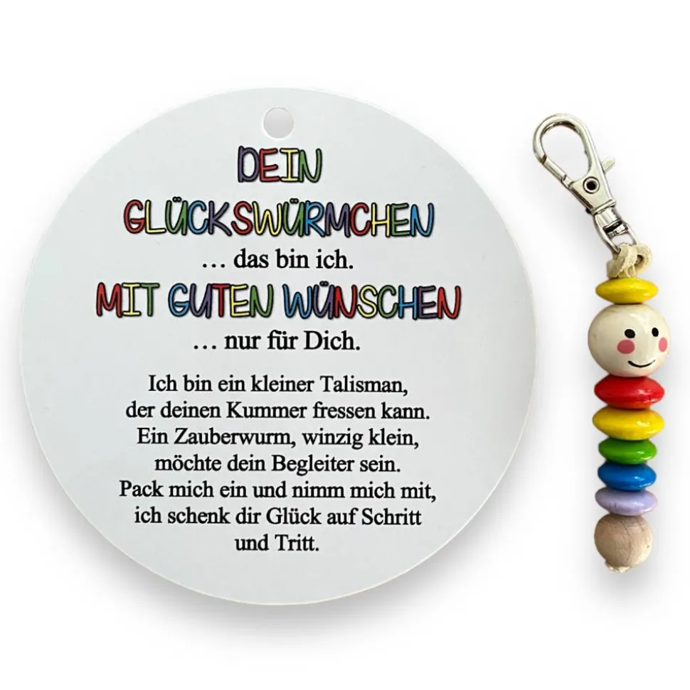Liebevoll gestaltetes Glückswürmchen, aus Holzperlen in Linsenform und mit einem süßen Holzkopf versehen. Die bei den Perlen und Motiven verwendeten Farben, Lacke und Beize entsprechen den rechtlichen Bedingungen der DIN EN71-3. Dadurch sind die Produkte schadstofffrei, schweiß- und speichelfest*. Das Würmchen soll dir Freude und Glück spenden – es soll dir helfen, wenn du Angst hast und dir in der Not beistehen. Ein kleines, niedliches Tierchen, welches du überall mit hinnehmen oder in/ an die Tasche hängen kannst. Es ist mit Karabiner ca. 9 cm lang und für dich ein treuer Begleiter auf all deinen Wegen. Man kann sie aber auch wunderbar verschenken. Das Würmchen kommt mit einem Geschenkanhänger Durchmesser 9,5cm in premium Hochglanz Qualität mit Spruch, verpackt in einem Organzasäckchen zu dir. KEIN SPIELZEUG – nicht für Kinder unter 3 Jahren geeignet.