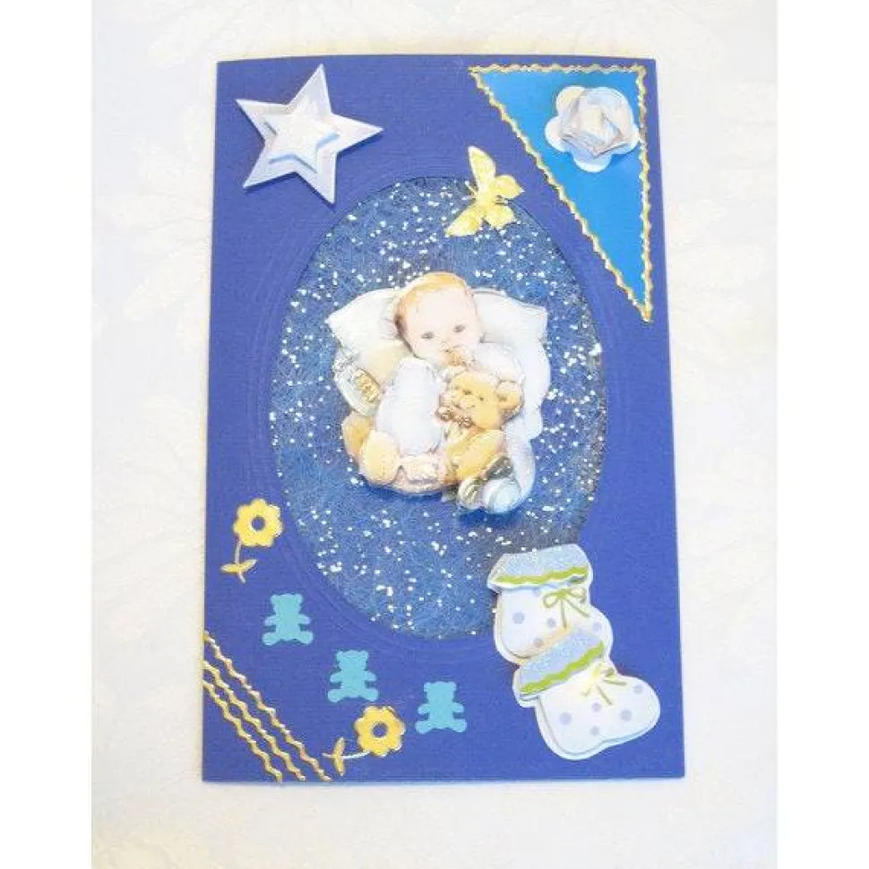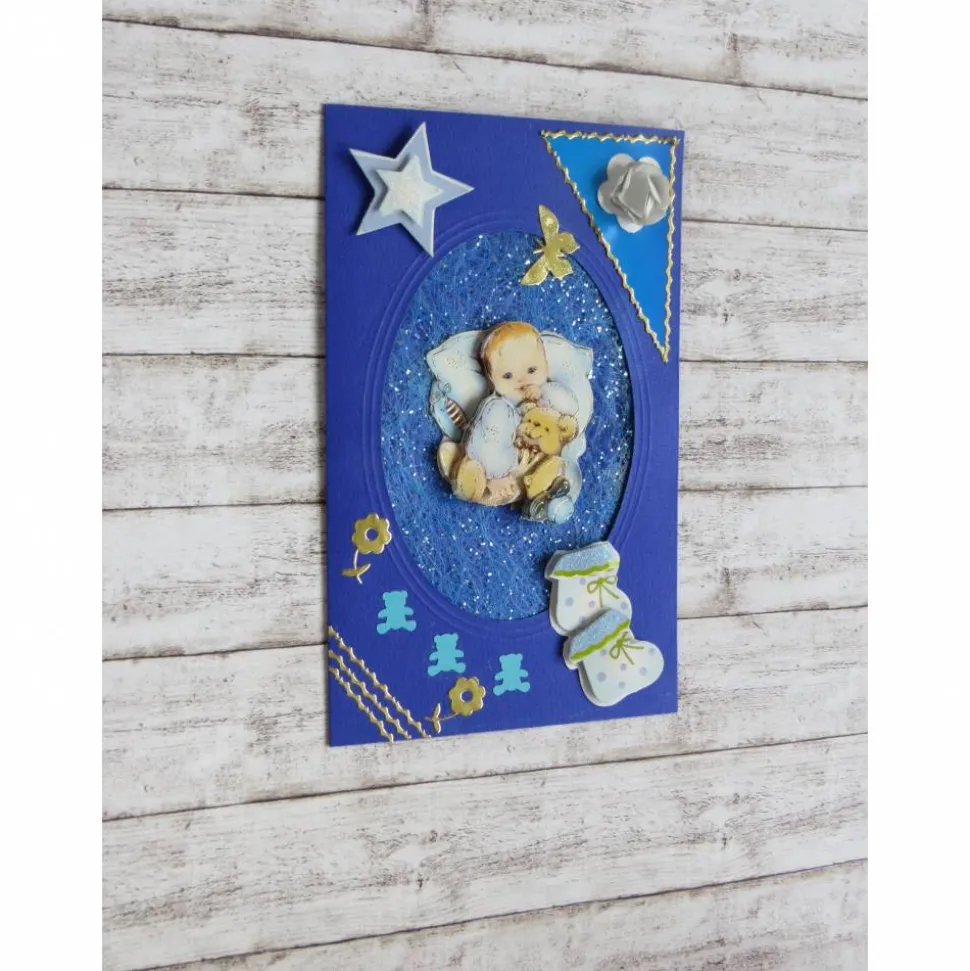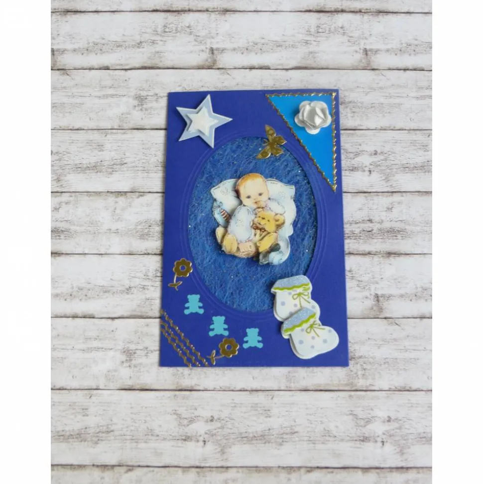 Verziert sind diese Glückwünsche, Grußkarte zur Geburt / Taufe eines Baby mit verschiedenen Dekomaterialien.