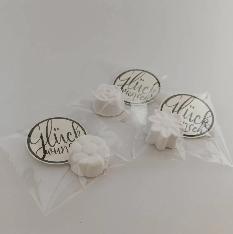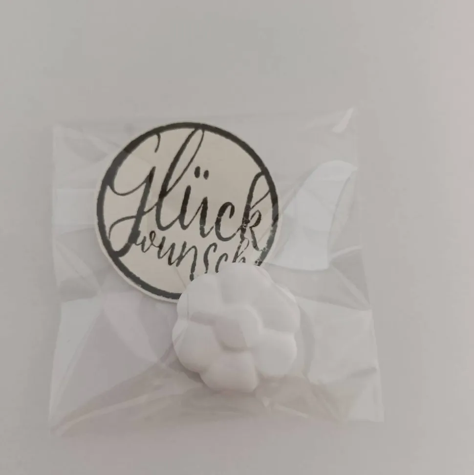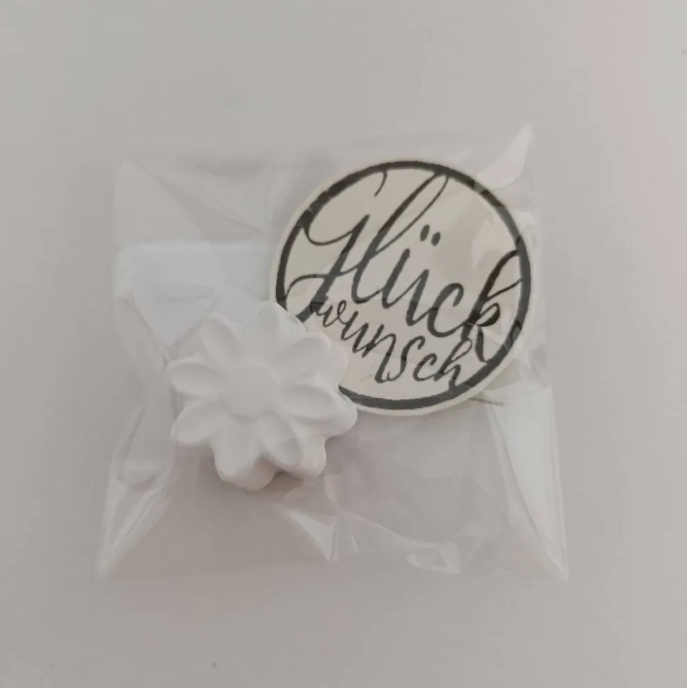 In dieser wunderschöne Tüte befindet sich ein Tonpapier mit der Aufschrift GLÜCKWUNSCH! und einer Blume aus Raysin. Die Tüte hat eine Größe von etwa 7,5 cm x 7,5 cm.