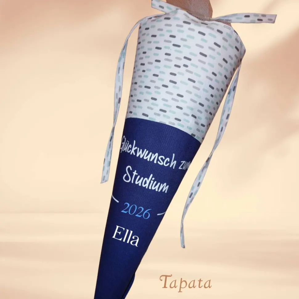 ➡ Namenswunsch: Auf Wunsch kann die Abschlusstüte mit dem Namen der Person versehen werden. Bitte geben Sie in das Feld Personalisierungswünsche den Namen ein. Max. 12 Zeichen (Sonderzeichen nur nach Rücksprache). Je nach Länge wird die Positionierung des Namens und die Größe angepasst.