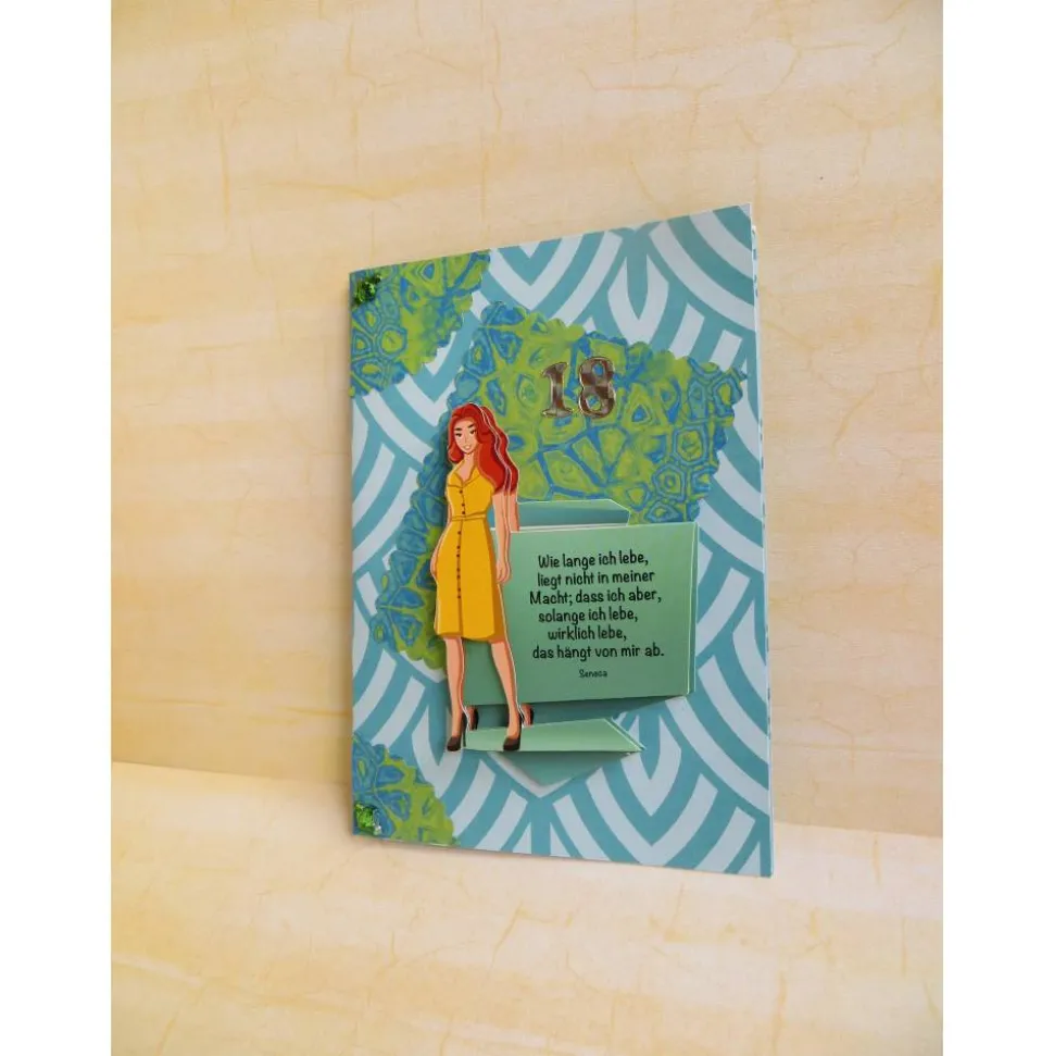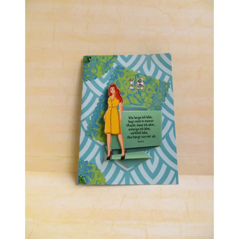 Die Geburtstagskarte selbst ist aus bedruckte Kartenkarton, mit der Zahl 18 dekoriert, verziert mit einem großen Bild mit Spruch.