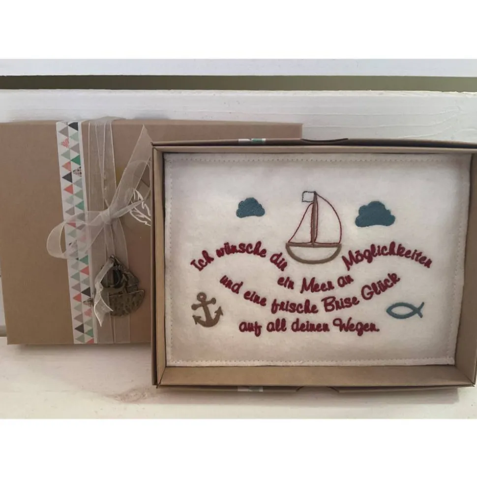 Verzierung des Kartondeckels mit Schlaufe und Metallanhänger Segelboot/Anker