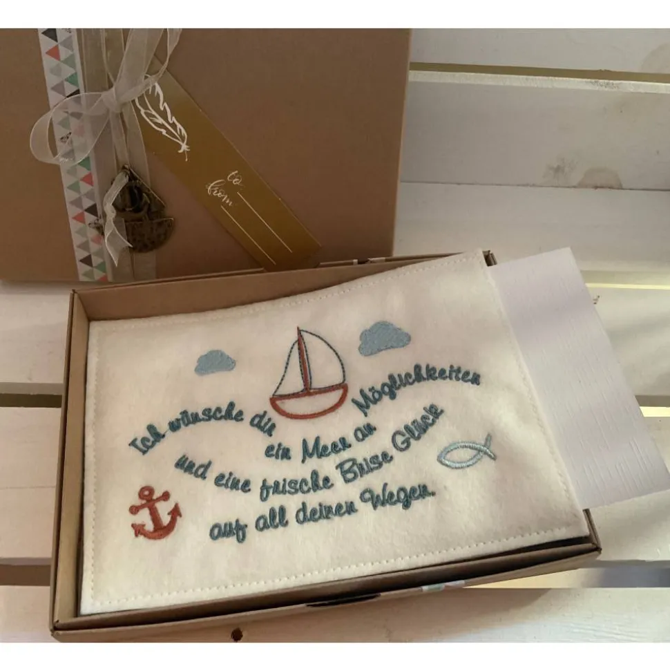 Verzierung des Kartondeckels mit Schlaufe und Metallanhänger Segelboot/Anker