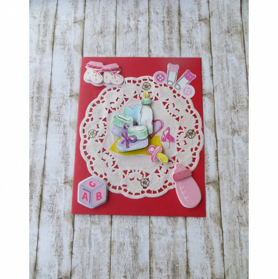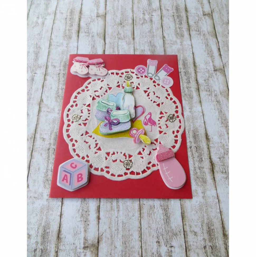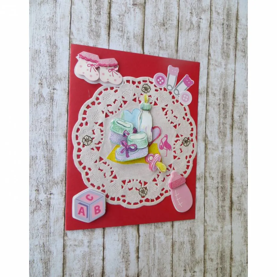 Verziert sind diese Glückwünsche, Grußkarte zur Geburt / Taufe eines Baby mit verschiedenen Dekomaterialien. Die Babykarte ist minimal kleiner als Din A5