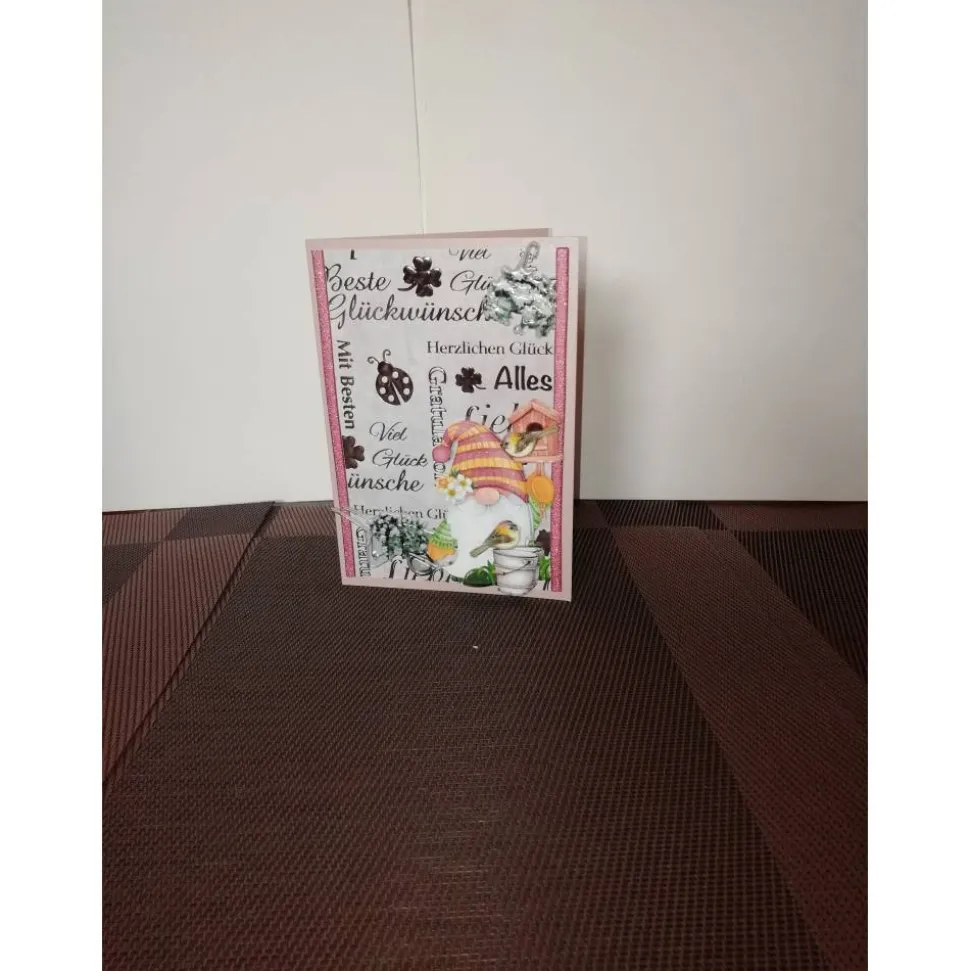 Verziert mit Gelstickern, in Form einer Schubkarre mit Blumen und einer Blumenampel und dem 3D Motiv in Form eines süßen Blumenwichtels der ein Vogelhaus in der Hand hält.