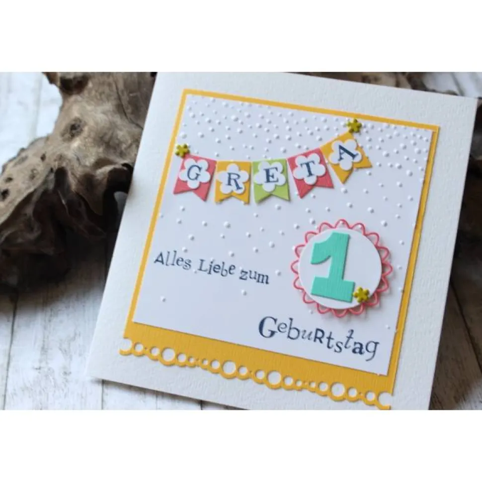 Farbiger Cardstock im Hintergrund ist an der unteren Kante mit einer verspielten Bordüre versehen.