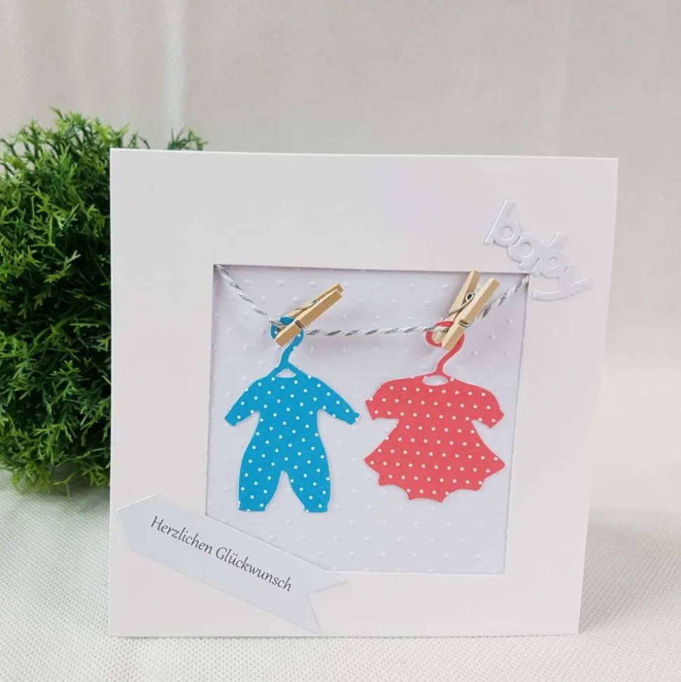 Material: Doppelkarte quadratisch, themenbezogene Stanzelemente, Baumwollkordel, Holzklammern