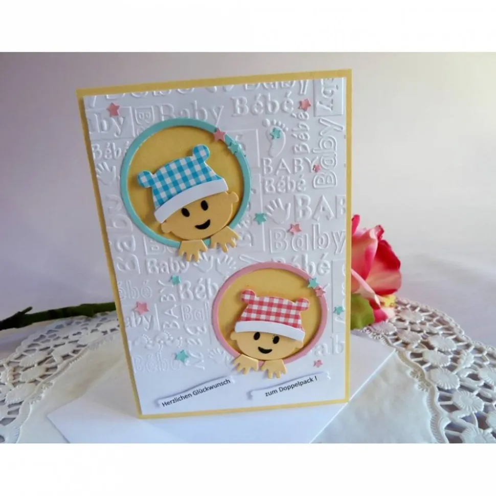 Aufwendig gearbeitete Klappkarte für ein Zwillingspärchen, mit schönen geprägtem Hintergrund, und Ausstanzungen aus denen je ein Baby schaut, viele kleine Sternchen schmücken noch die Karte.