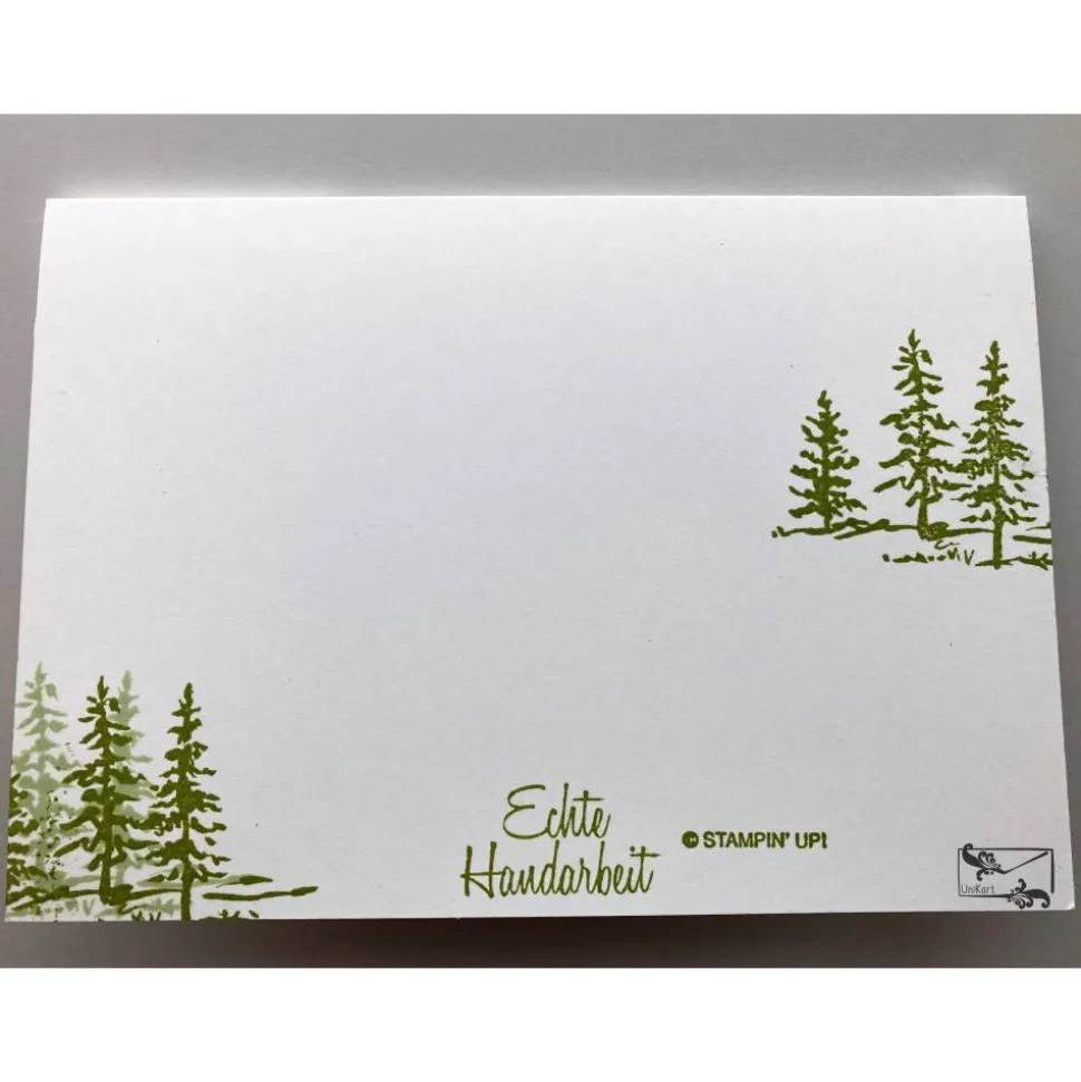 Auf der Rückseite der Karte habe ich ein paar Tannen gestempelt sowie einen Copyright Stempel und einen Stempel Echte Handarbeit.