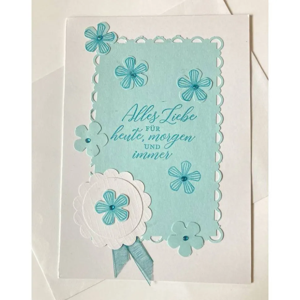 Die Grundkarte besteht aus einem weißen Farbkarton mit einem in der Farbe Babyblau bestempelten Aufleger.