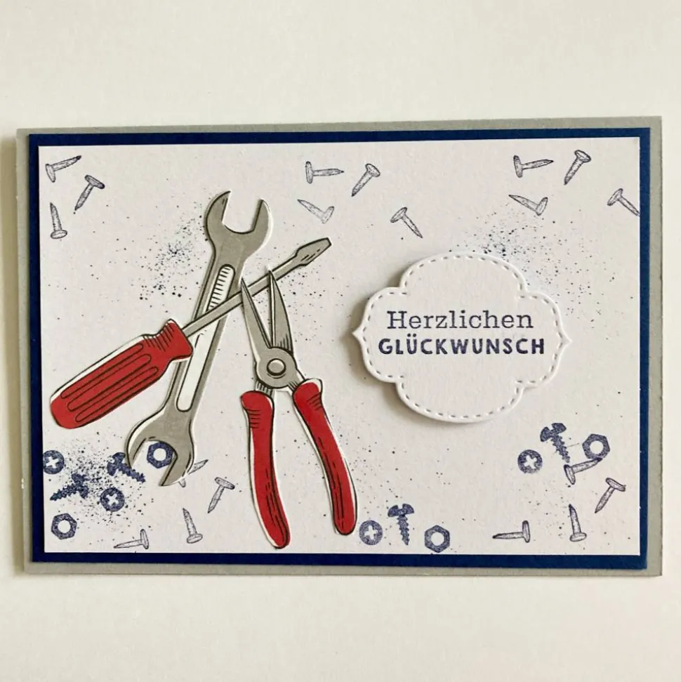 Die Karte ist gestaltet aus grauem, Dunkelblauen und weißem Farbkarton. Verziert mit gestempelten Schrauben & Nägeln und ausgeschnittenem Werkzeug aus Designpapier.