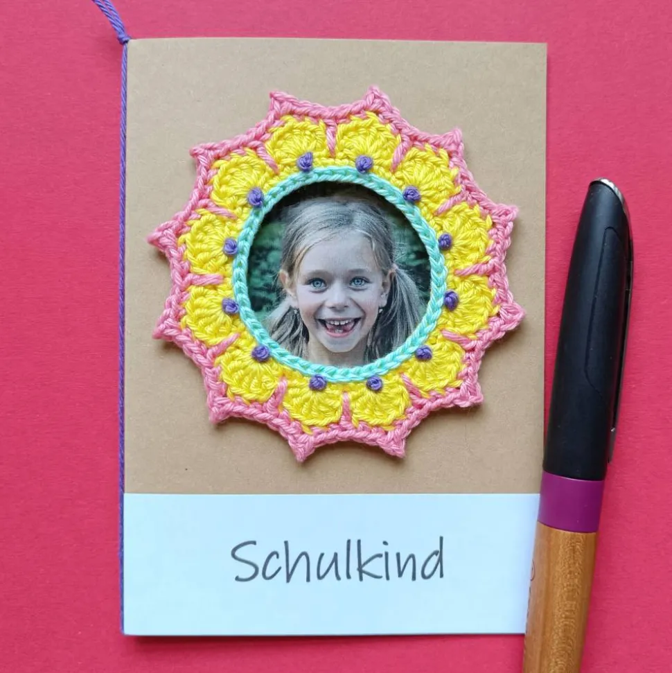 Mit Foto und Namen des Kindes samt Einschulungsdatum ist diese Karte eine schöne Erinnerung für später. Die Karte ist natürlich auch übertragbar auf den Kindergartenstart, einen Schulwechsel oder andere Anlässe.