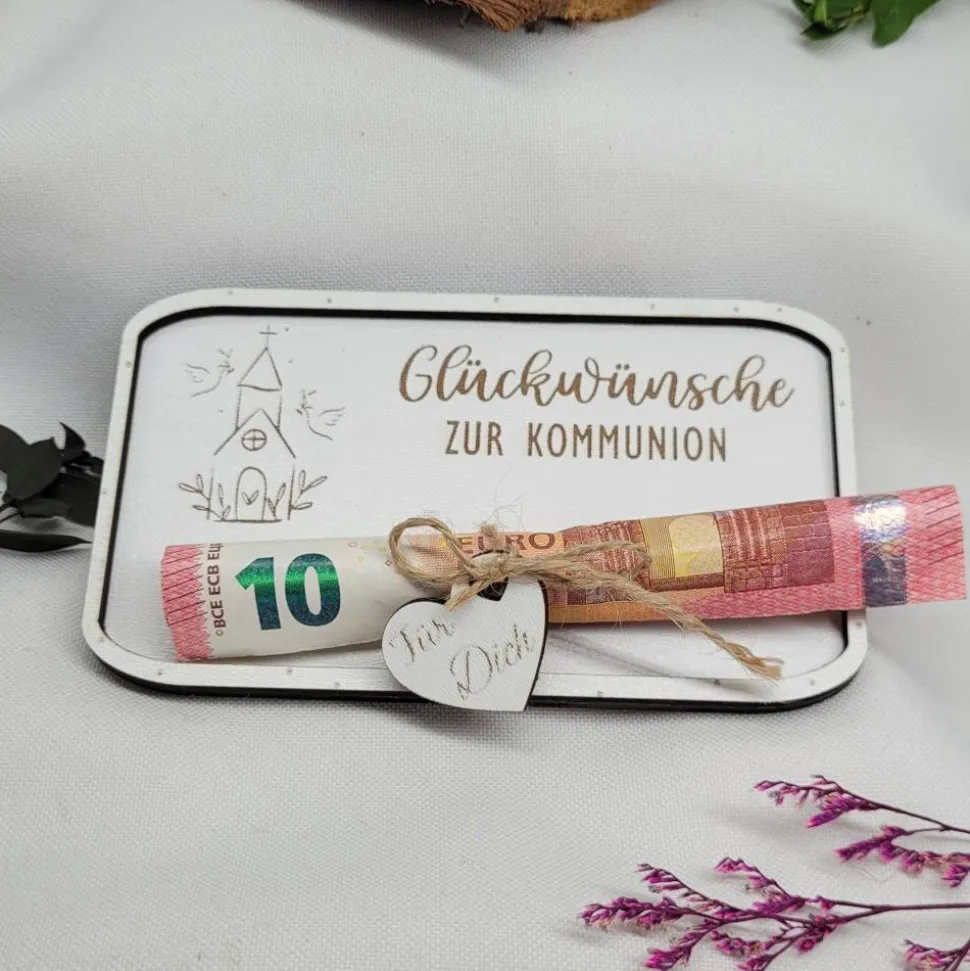 Diese elegante Glückwunschkarte zur Kommunion ist nicht nur eine wunderschöne Geschenkidee, sondern hinterläßt einen bleibenden Eindruck. Der dekorative Holzteller mit graviertem Motiv der Kirche und Tauben ist ein echter Hingucker. Geld kann stilvoll mit dem beiliegenden Faden und dem Holzherz „Für Dich“ befestigt werden, um das Geschenk noch edler zu machen.