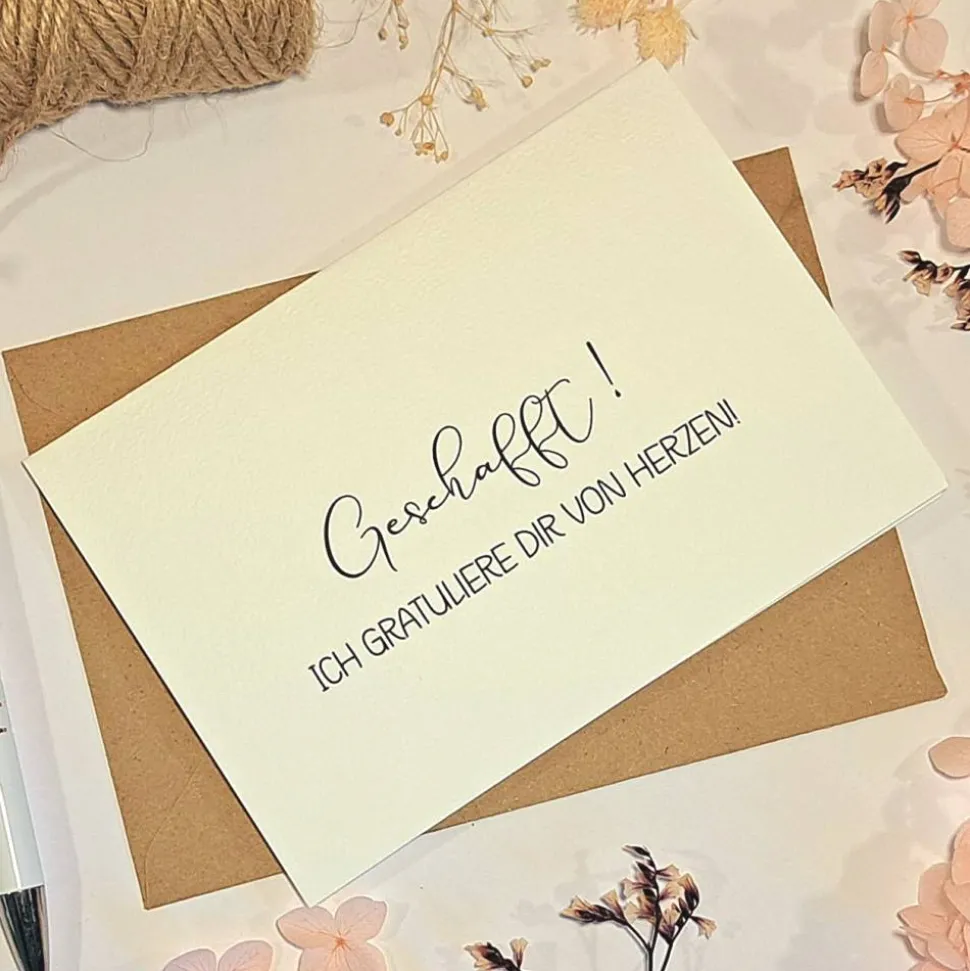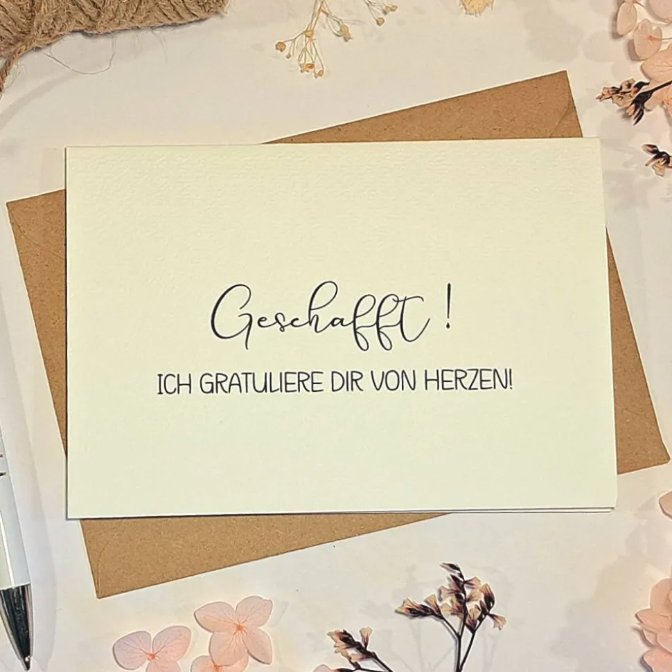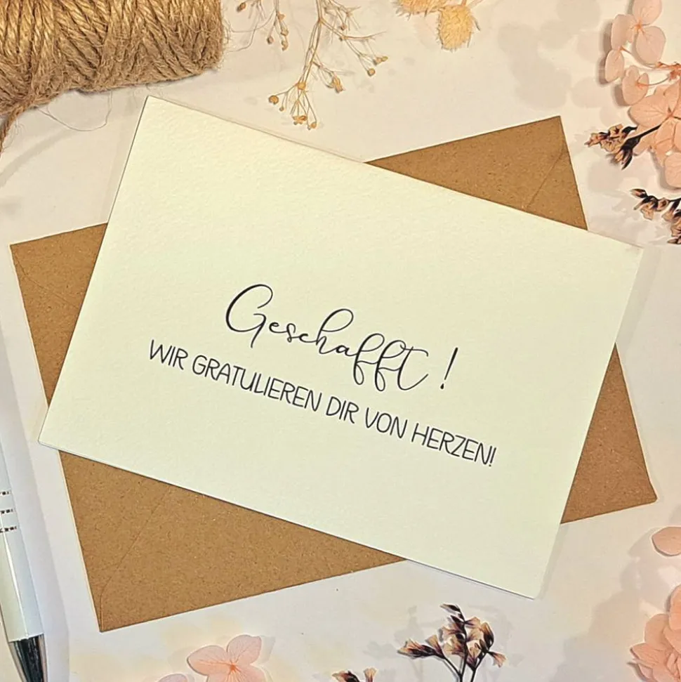 Auf der Geschenkkarte steht kunstvoll entweder „Geschafft! Wir gratulieren Dir von Herzen!“ oder „Ich gratuliere Dir von Herzen!“. Der passende Umschlag aus Kraftpapier macht das Geschenk komplett und sorgt für eine hochwertige Präsentation.
