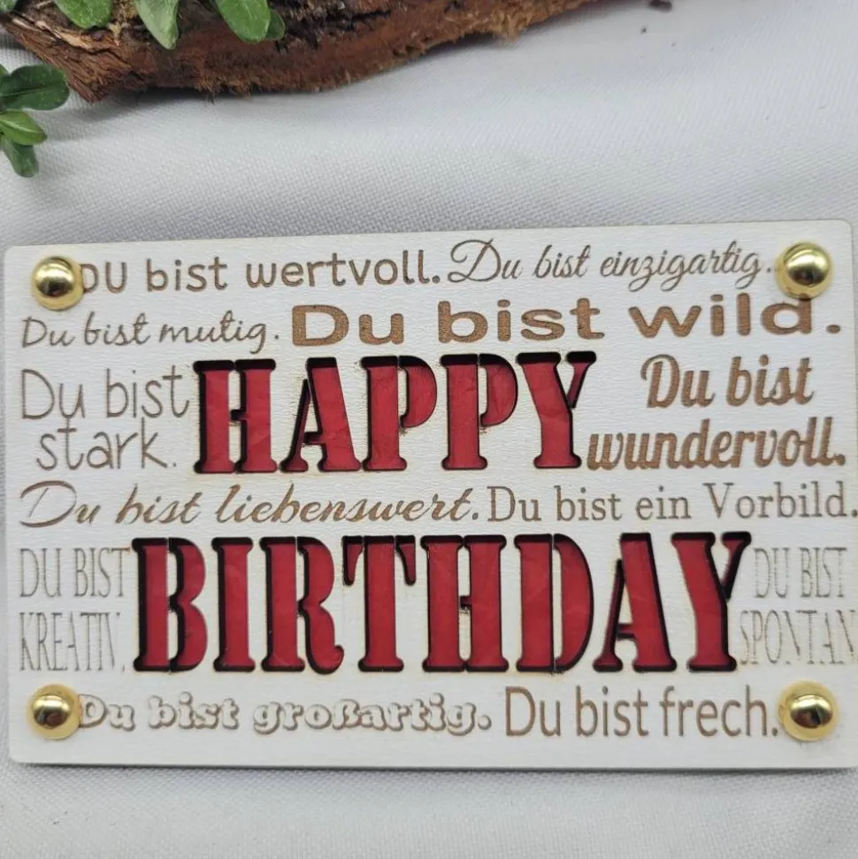 Verschenken Sie eine hochwertige Glückwunschkarte aus Holzfaser. Diese Karte ermöglicht es Ihnen, Geld auf eine besondere Art und Weise zu verschenken. Einfach die beiden Kartenhälften öffnen, Geldschein dazwischenlegen und mit den mitgelieferten Heftklammern zusammenstecken. Durch das Wort „Happy Birthday2 erkennt man den Geldschein.Eine schöne und bleibende Erinnerung für den Empfänger, da die Karte aus Holz ist. Mehr als nur eine Papierkarte – ein einzigartiges Geschenk.