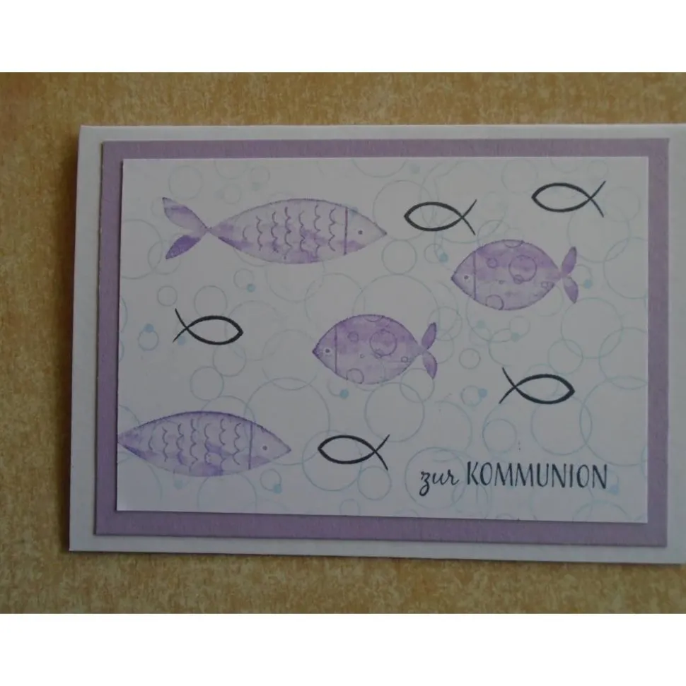 verziert wurden diese Kommunionkarten mit Fisch Stempel zur Kommunion