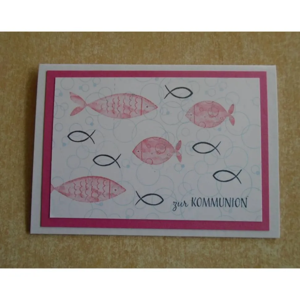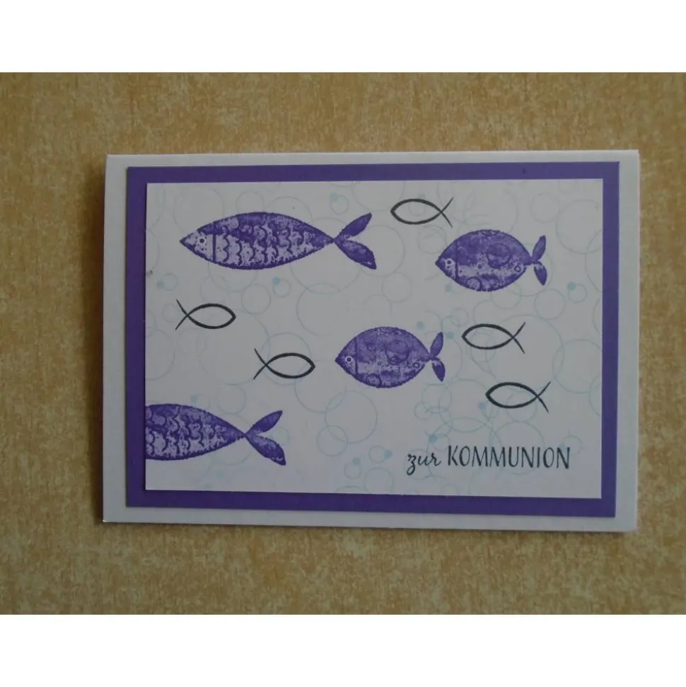 verziert wurden diese Kommunionkarten mit Fisch Stempel zur Kommunion