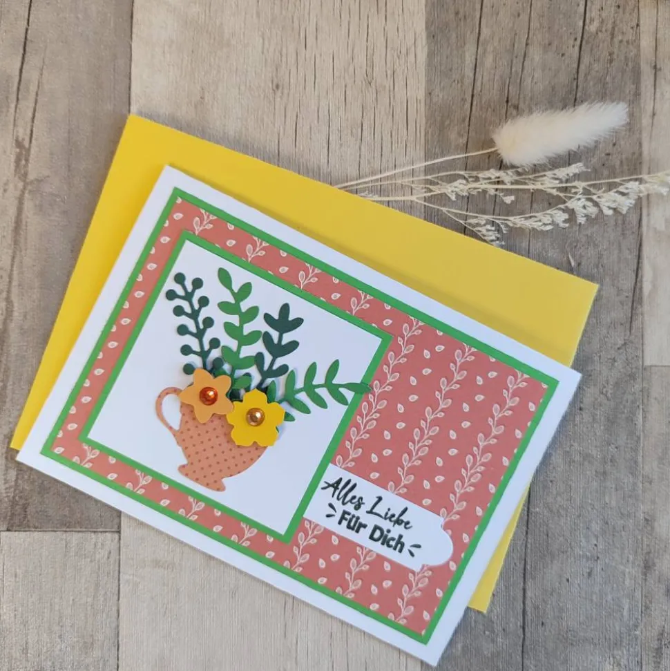 Auf einem weißen Kartenrohling habe ich verschiedene Papiere und Designpapiere geklebt. Eine farblich passende von mir gestanzte Tasse, sowie Blätter und Blumen ergänzen die Karte Auf den Blüten habe ich Diamond Sticker aufgebracht. Der Gruß ist gestempelt.