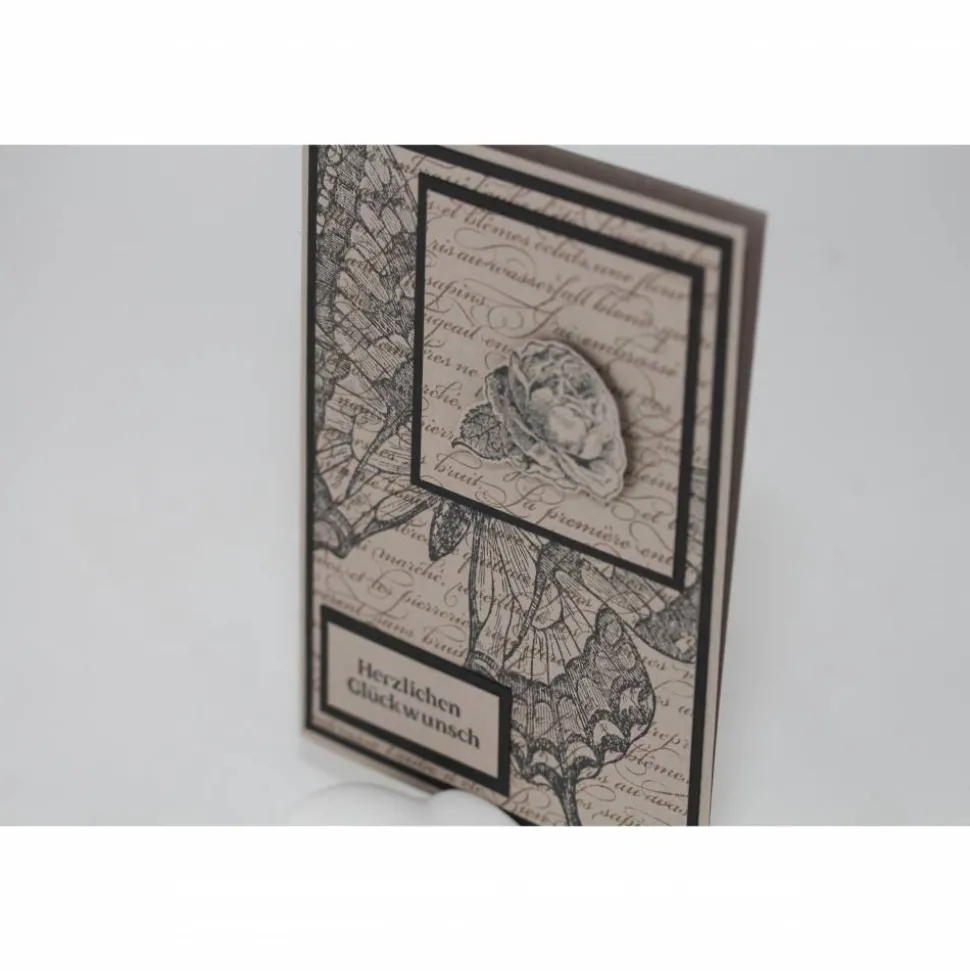 Die Karte wurde gefertigt in den Farben Taupe und Schwarz. Auf die Grundkarte wurde Ton-in-Ton ein Schriftstempel als Hintergrund gestempelt. In Schwarz wurde darüber ein großer Schmetterling gestempelt. Auf einem ebenfalls mit diesem Schriftstempel gefertigten Panel wurde eine schwarz gestempelte Rose ausgeschnitten und mit Abstandklebepads aufgebracht. Der Gruß wurde in Schwarz auf Taupe gestempelt und schwarz gemattet.