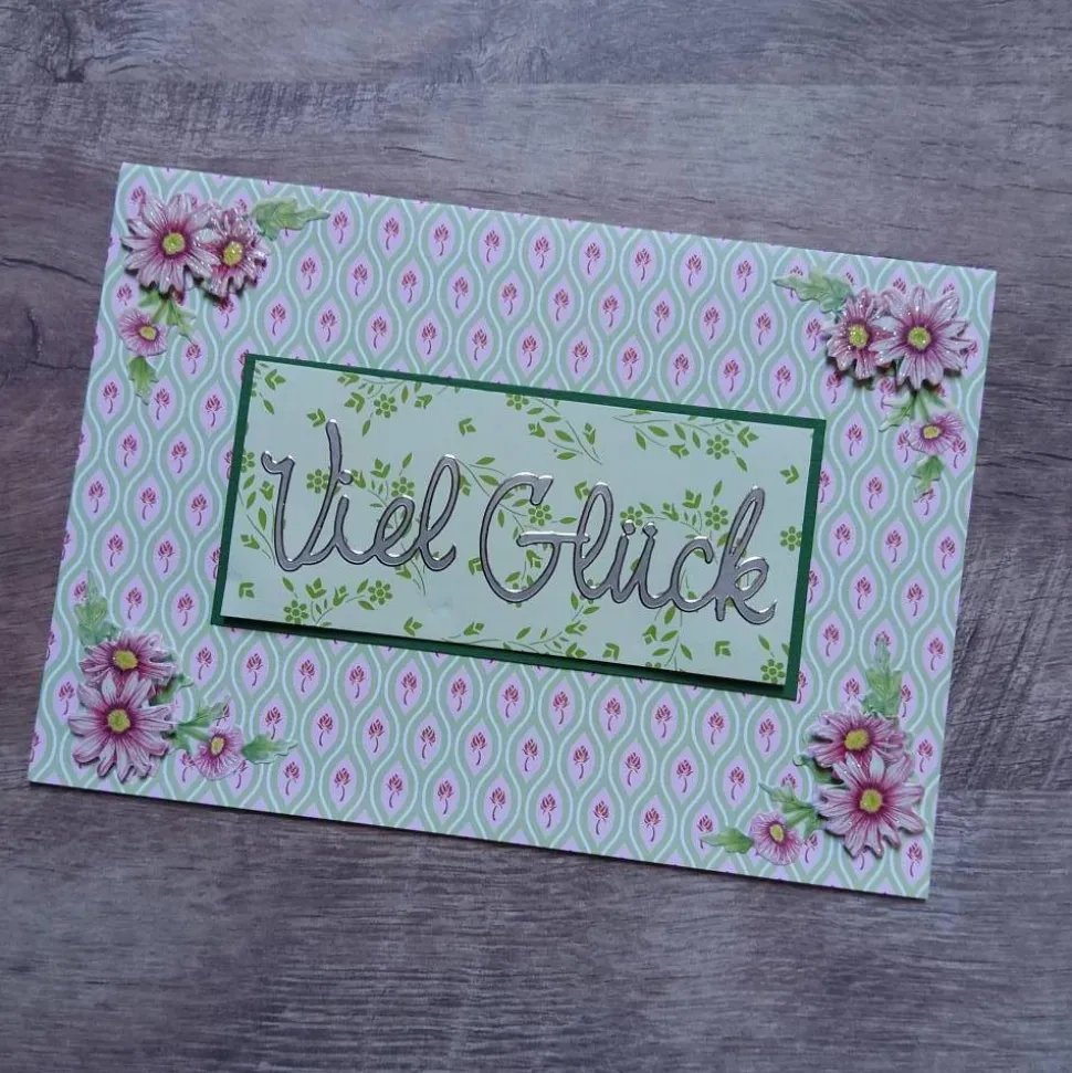Die Karte besteht aus verschiedenen Papieren. Blumensticker sowie der Schriftzugsticker vollständigen sie. In der Karte liegt ein weißes Einlegeblatt.