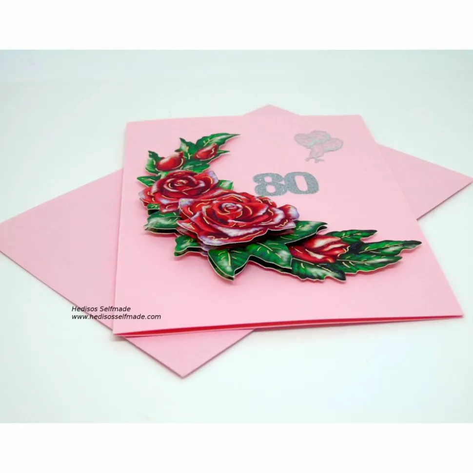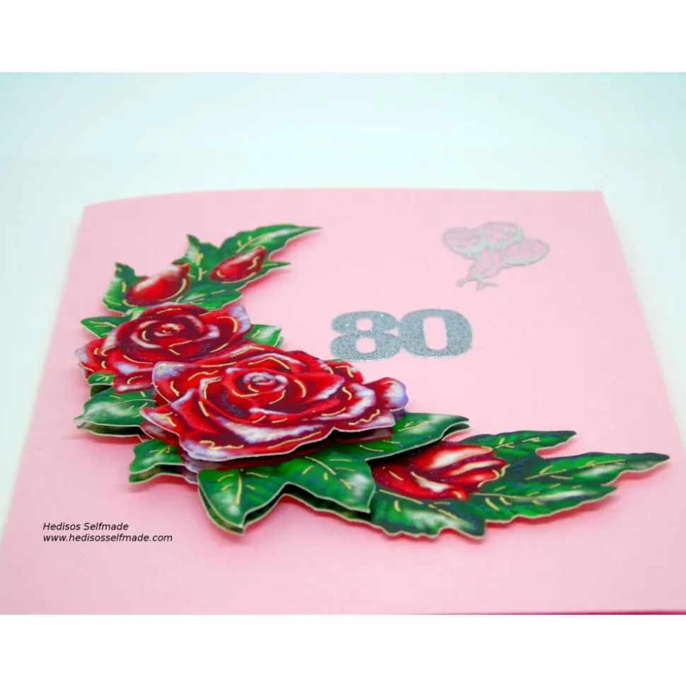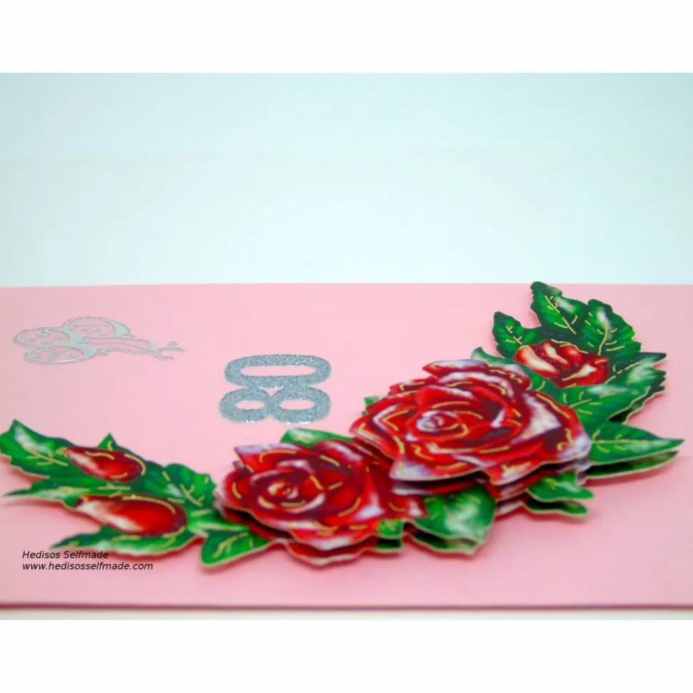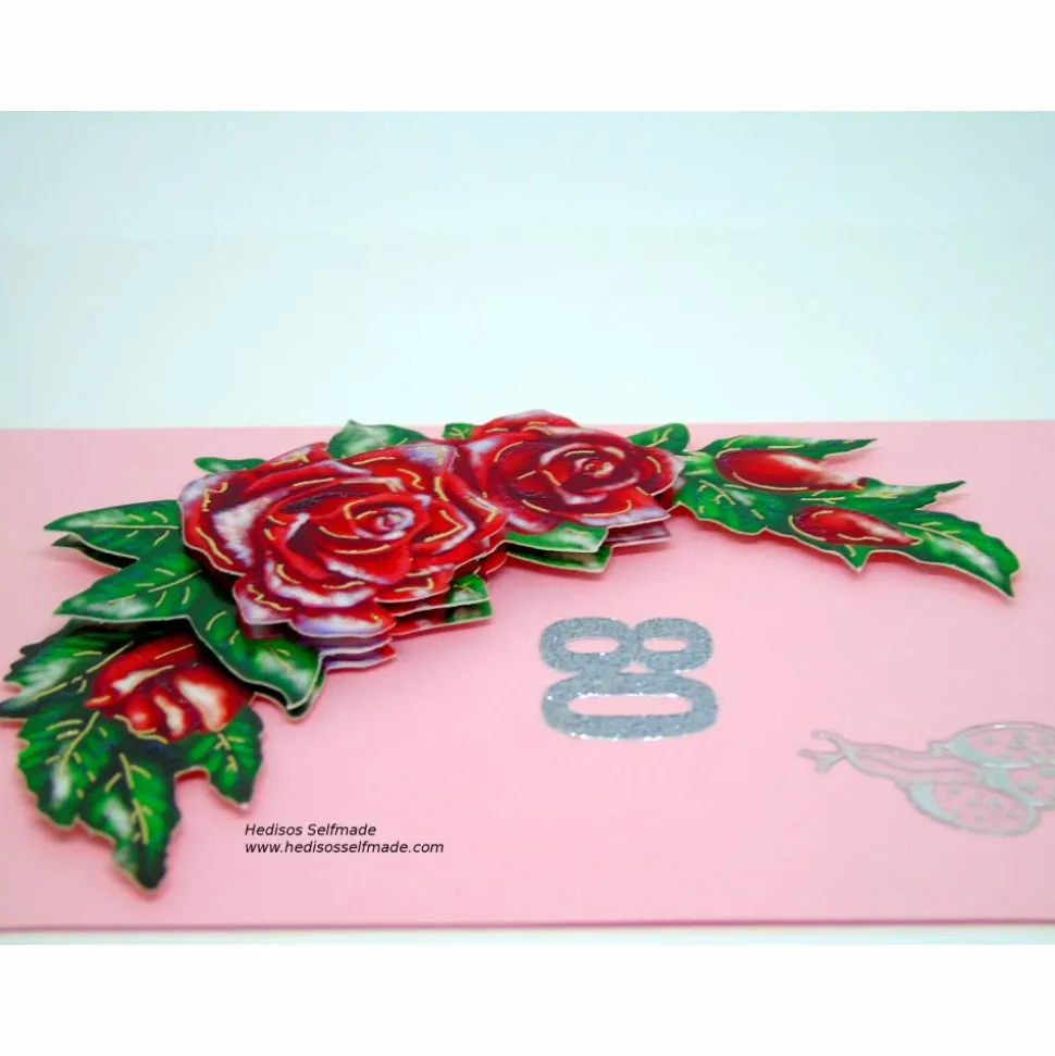 Das Motiv aus roten Rosen wurde von mir in 3-D-Optik gestaltet. Im Innenteil der Karte habe ich den silbernen Schriftzug „Zum Geburtstag alles Gute“ aufgebracht.