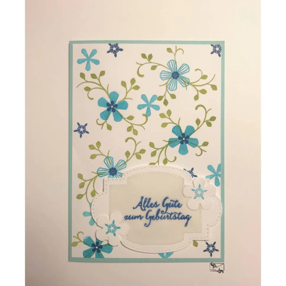 Die Karte ist Hellblau mit einem weißen Kartenhintergrund. Diesen Kartenhintergrund habe ich mit Blättern und Blüten in Grün und Türkis bestempelt.