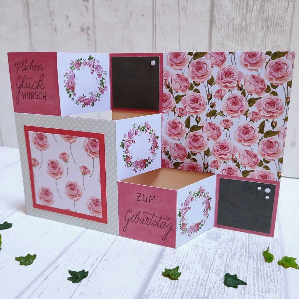 Hier hab ich eine Faltkarte gebastelt. Ich habe verschiedenen Tonkarton und Designpapier verwendet und mit ein paar Acrylperlen beklebt. Die Schrift ist handgeschrieben. Zusammengeklappt misst die Karte 15*15 cm, auseinandergefalten 25*15 cm.