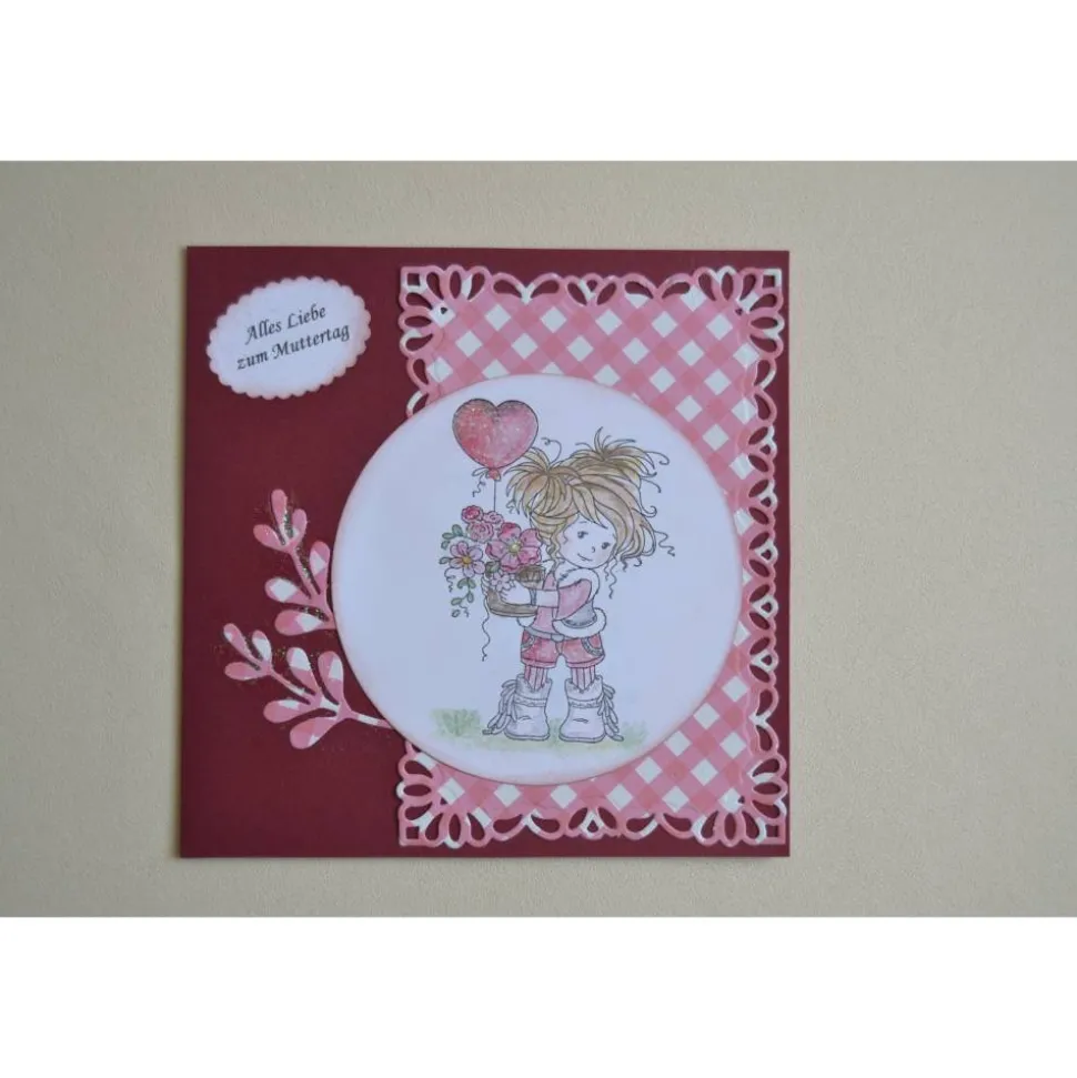Glückwunschkarte zum Muttertag. Stempelmotiv „Mädchen mit Luftballon“ in rot-rosa. Die Karte ist mit Stanzteilen und Stempelmotiv (von Hand bemalt) versehen. Sie ist 16 x 16 cm und wird mit einem passendem Umschlag in einer Folienhülle geliefert.