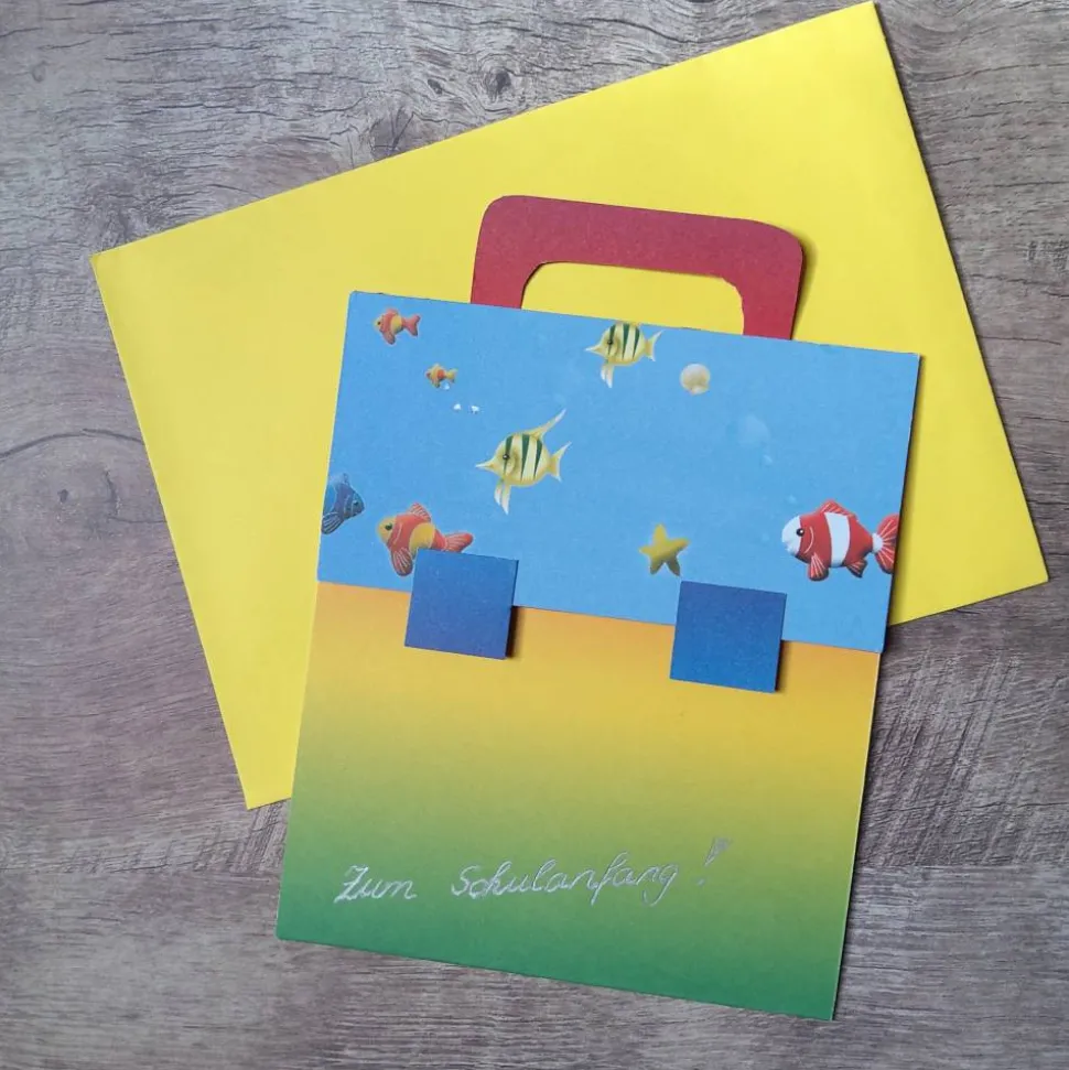 Die Karte hat die Form eines Schulranzen. Der Schriftzug ist handgeschrieben. In der Karte liegt ein weißes Einlegeblatt.