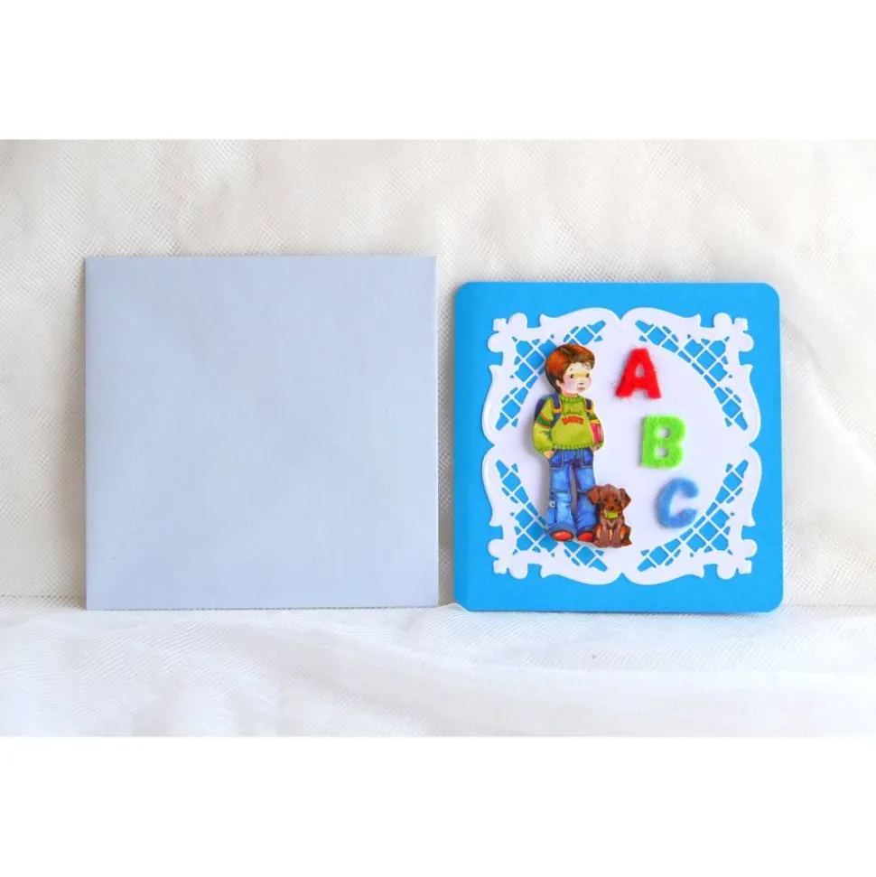Glückwunschkarte zum Schulanfang blau-hellblau, Junge mit Filzbuchstaben ABC (9). Die Glückwunschkarte ist 13 x 13 cm und mit 3D Bildern verziert. In der Karte befindet sich ein Einlegepapier das beschriftet werden kann. Sie werden mit farblich passendem Kuvert geliefert.