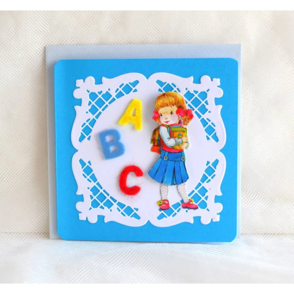 Glückwunschkarte zum Schulanfang blau-hellblau, Mädchen mit Filzbuchstaben ABC (8). Die Glückwunschkarte ist 13 x 13 cm und mit 3D Bildern verziert. In der Karte befindet sich ein Einlegepapier das beschriftet werden kann. Sie werden mit farblich passendem Kuvert geliefert.