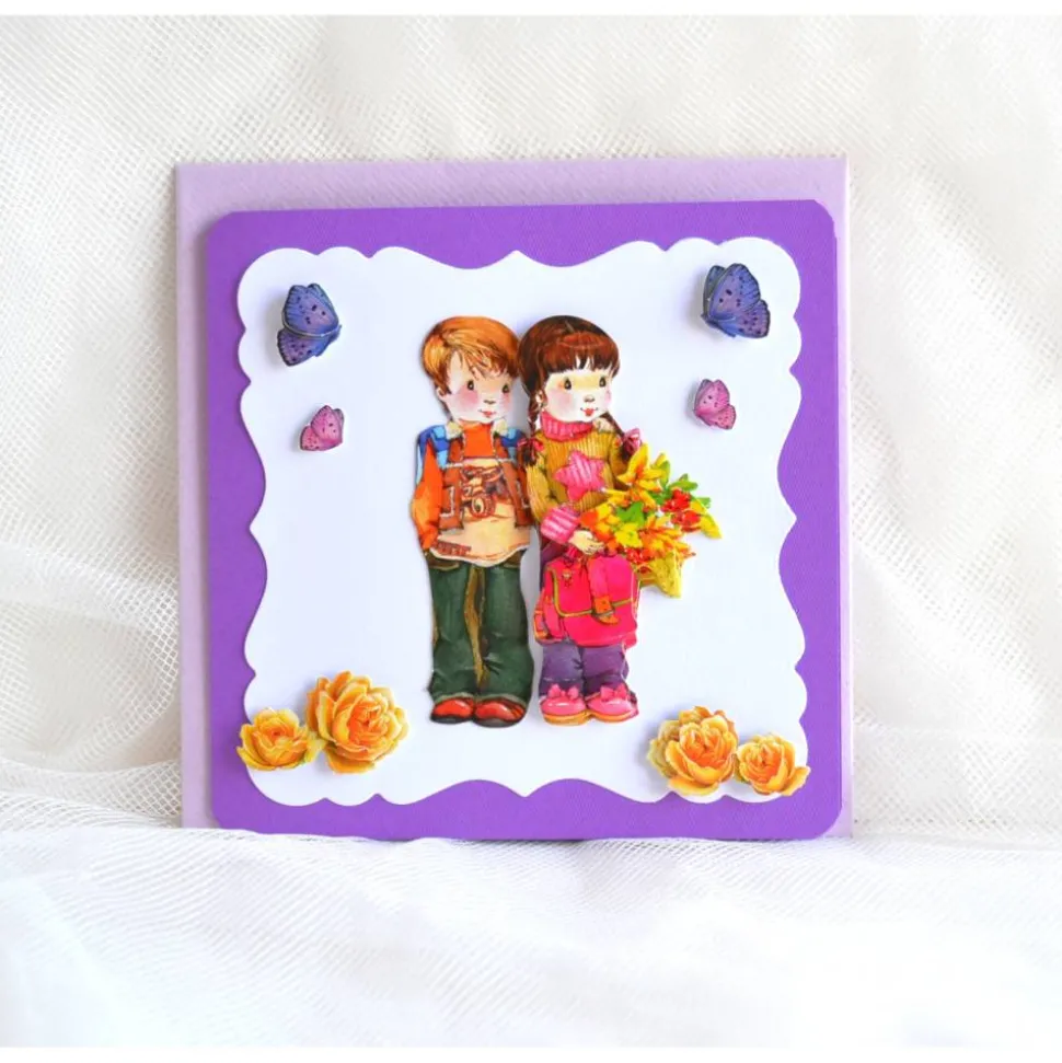 Glückwunschkarte zum Schulanfang Junge und Mädchen, lila-flieder (3). Die Glückwunschkarte ist 13 x 13 cm und mit 3D Bildern verziert. In der Karte befindet sich ein Einlegepapier das beschriftet werden kann. Sie werden mit farblich passendem Kuvert geliefert.