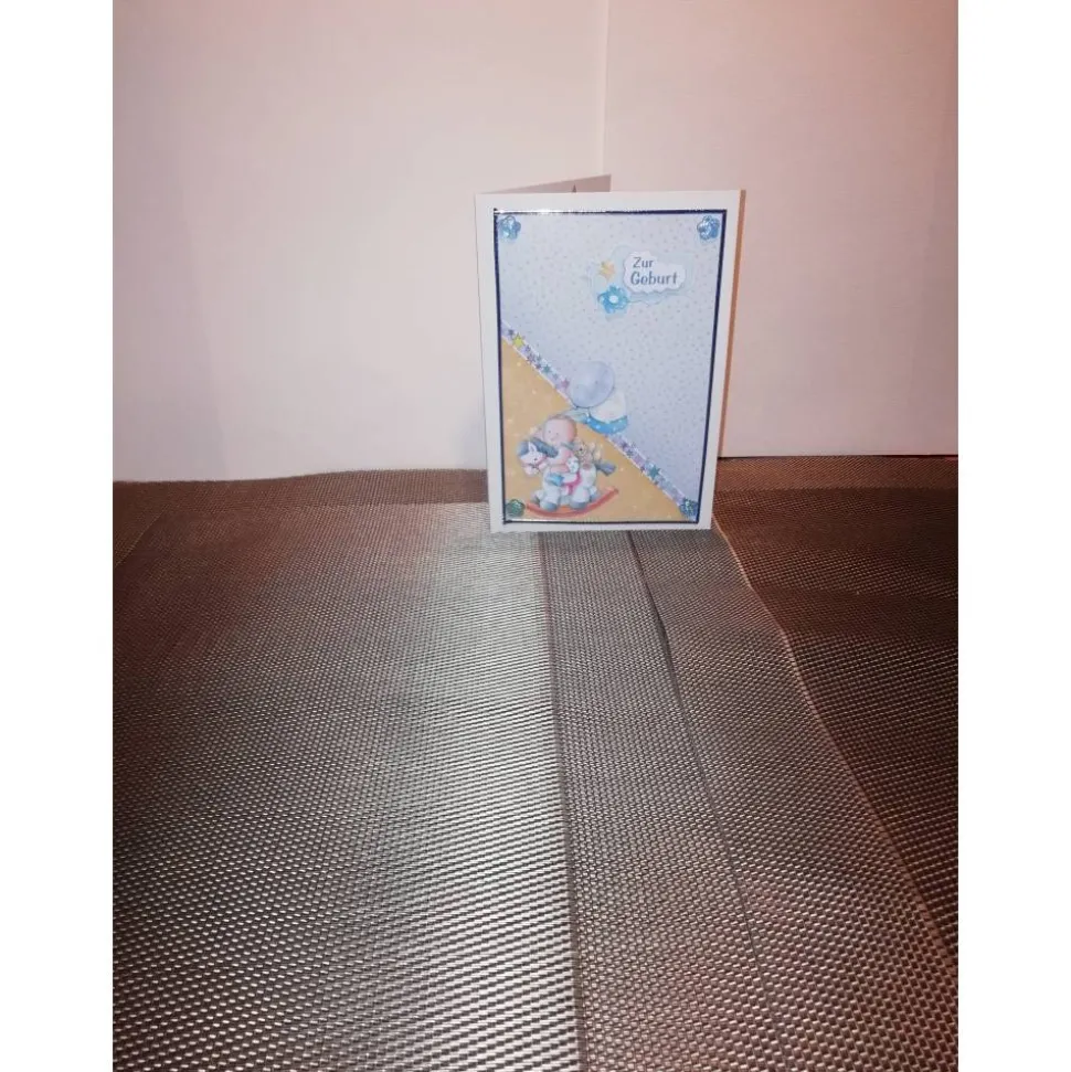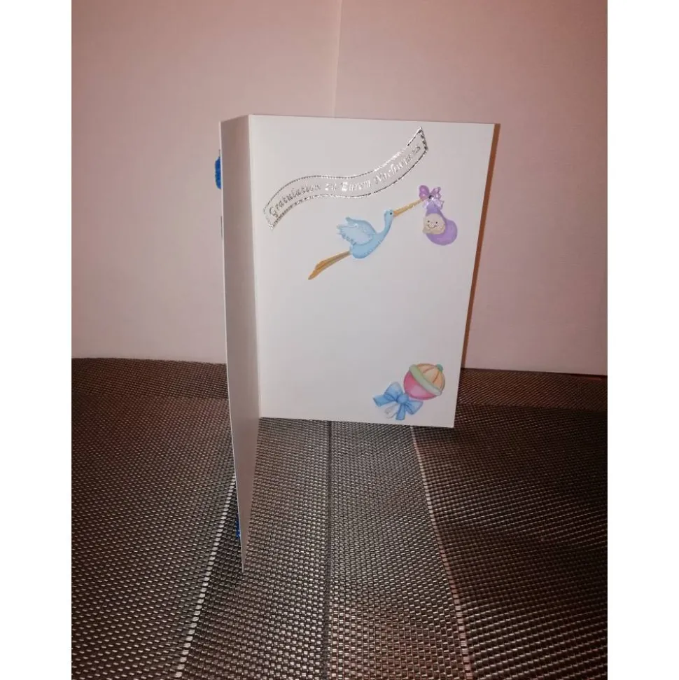 Auf der rechten Innenseite habe ich einen Gravurschwungliniensticker, mit dem Glückwunsch: Gratulation zu Eurem Nachwuchs und kleine 3D Sticker mit einer Rassel und einem Klapperstorch angebracht.