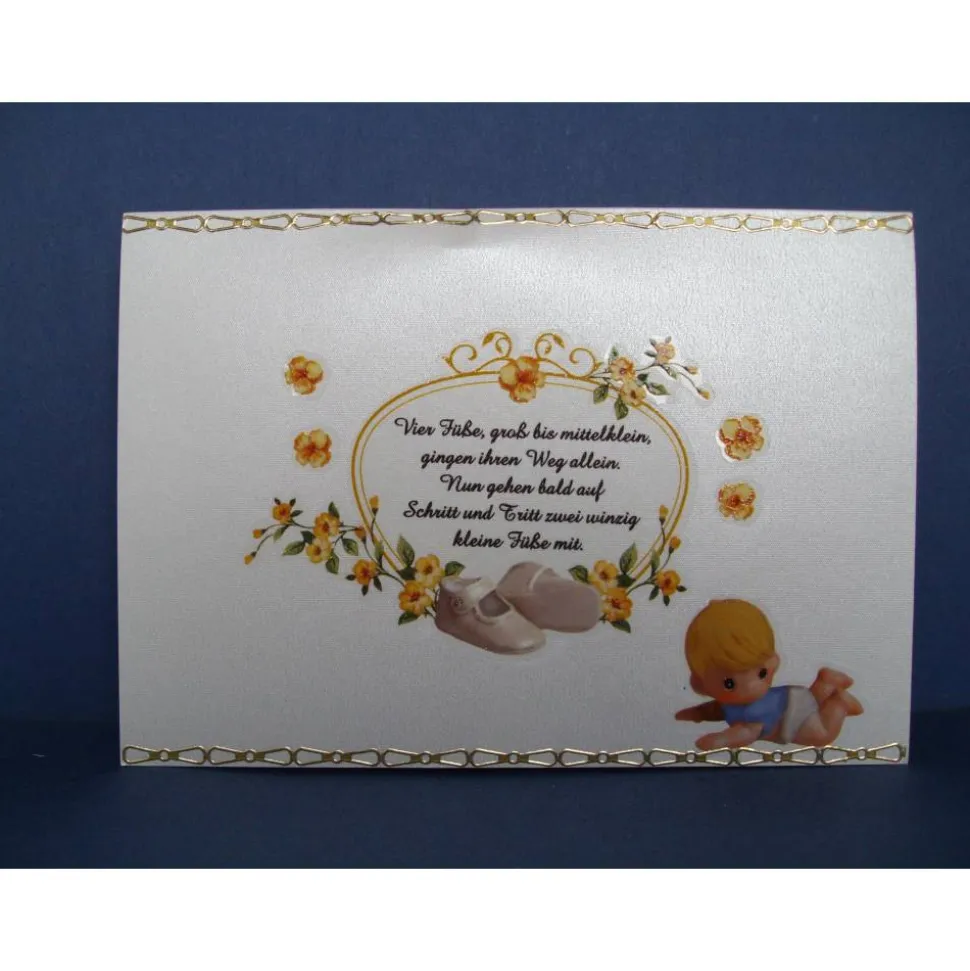 Unterhlan auch mit einer weissen Halbperlenbodüre und dem Gravurschwunglinienspruchsticker: Die besten Wünsch zur Geburt und dem 3D Motiv mit dem kleinen niedlichen Baby in einem grünen Körbchen.