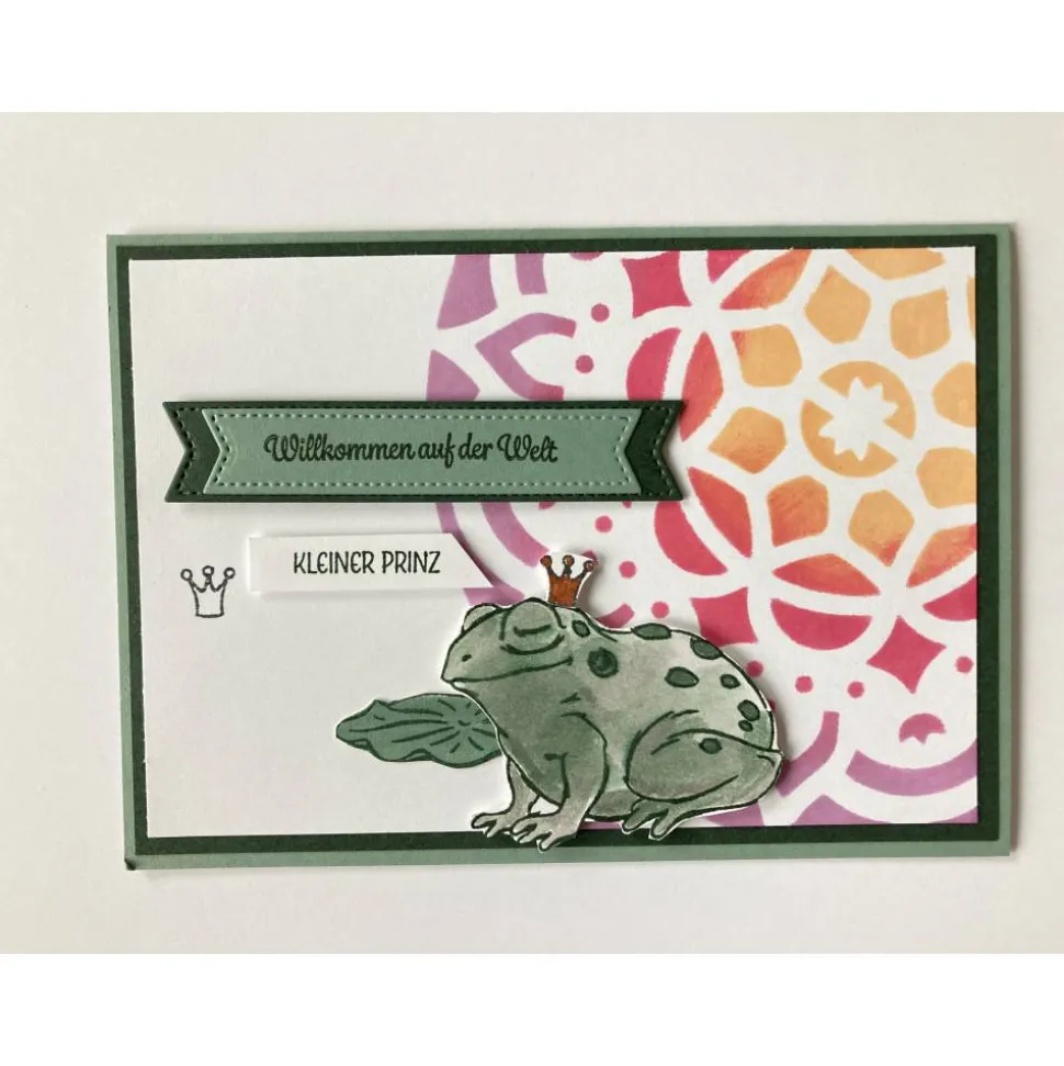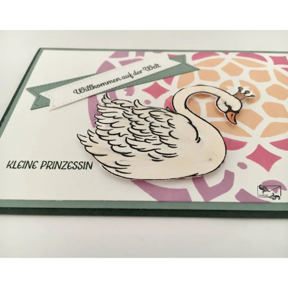 Der Schwan/ Frosch und das Etikett sind mit Abstandshalter auf die Karte geklebt, so ist ein 3 D Effekt entstanden.