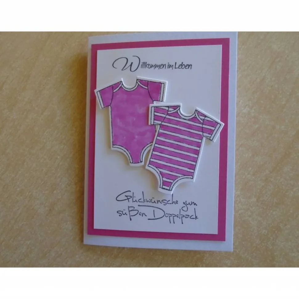 Hier seht ihr eine schöne Glückwunschkarte zur Geburt oder Taufe von Zwillingen von mädchen mit Body..
