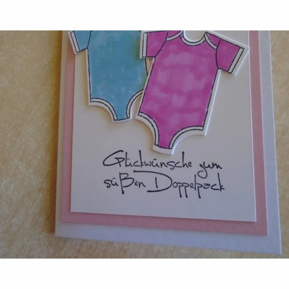 Hier seht ihr eine schöne Glückwunschkarte zur Geburt oder Taufe von Zwillingen mit Body von Mädchen und jungen