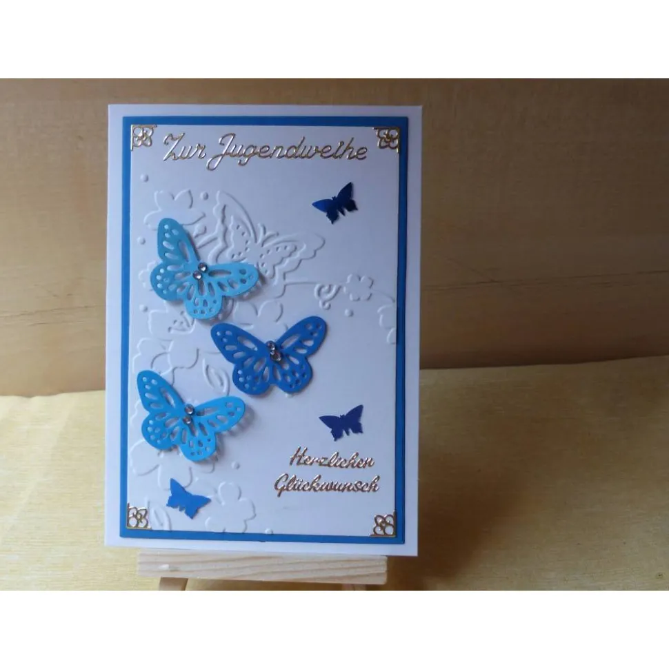 Die Grundekarte ist weiß mit blauen Tonpapier,geprägten weißen Papier unterlegt