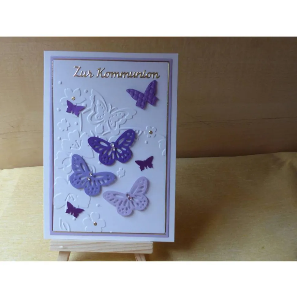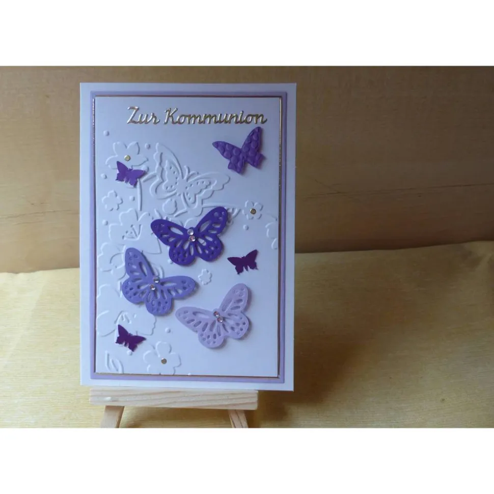 als Deko sind 3 Schmetterlinge in drei verschiedenen Farben und 3 kleine Schmetterlinge angebracht.