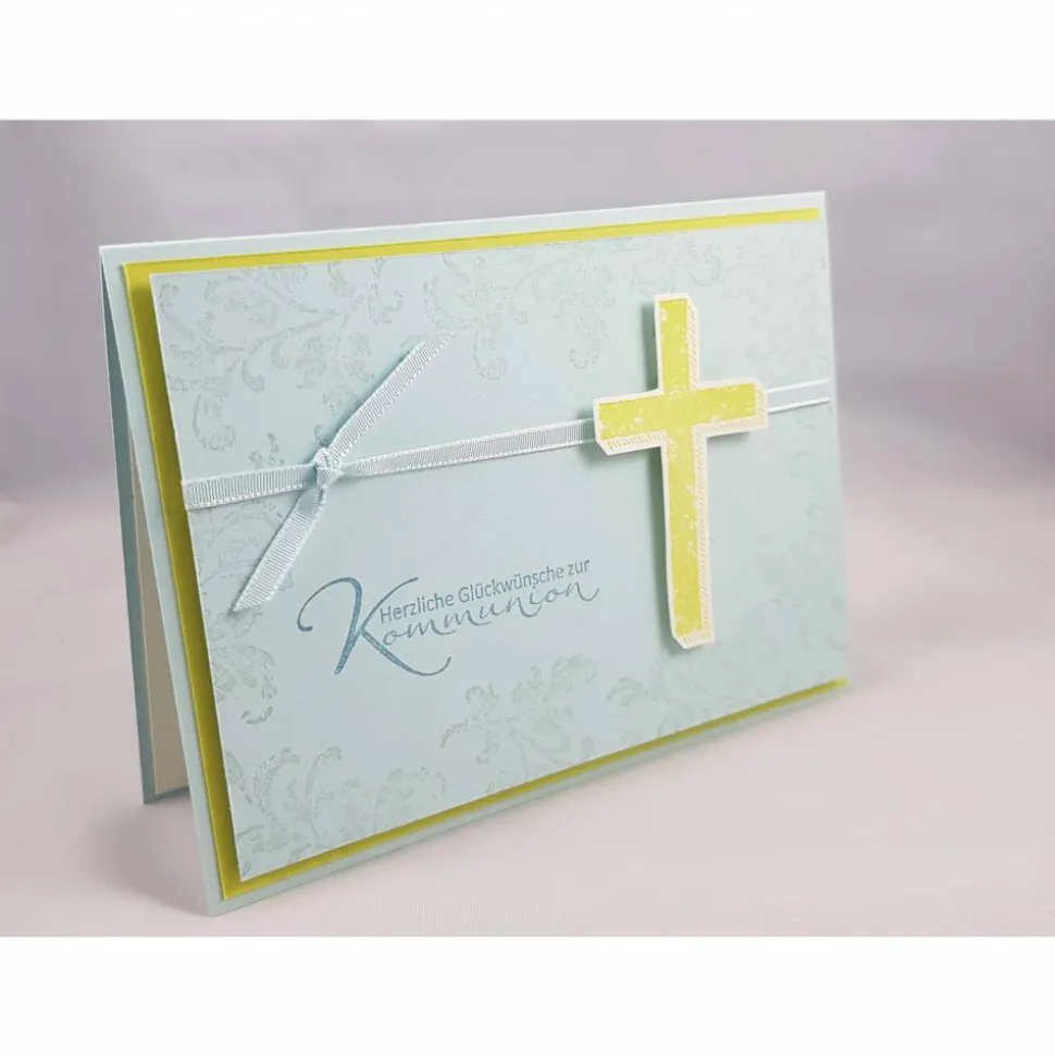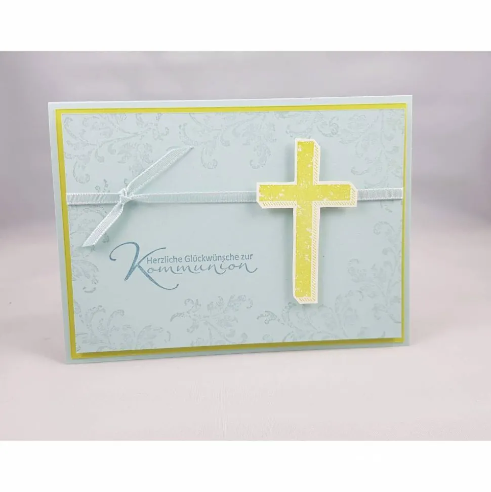 Die Grundkarte ist hellblau. Darauf befindet sich ein Aufleger in limette, der mit einem Aufleger in hellblau getoppt wird. Der oberste Aufleger ist rundherum Ton-in-Ton mit zarten Ranken bestempelt. Das Kreuz wurde in limette gestempelt, ausgeschnitten und mit Abstandklebepads aufgebracht. Um die Karte schlingt sich ein schmales Band in hellblau, das auf der Vorderseite verknotet wurde. Die Glückwünsche wurden ebenfalls Ton-in-Ton gestempelt.