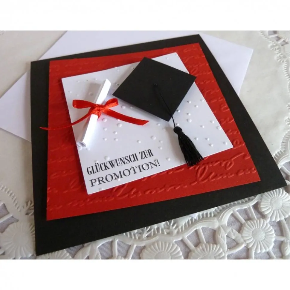 Quadratische Klappkarte in Handarbeit gefertigt zur Promotion, mit geprägtem Hintergrund, Doktorhut, handgefertigter Quaste und Schriftrolle. Die Glückwunschkarte wird mit Einlegeblatt und Kuvert geliefert.