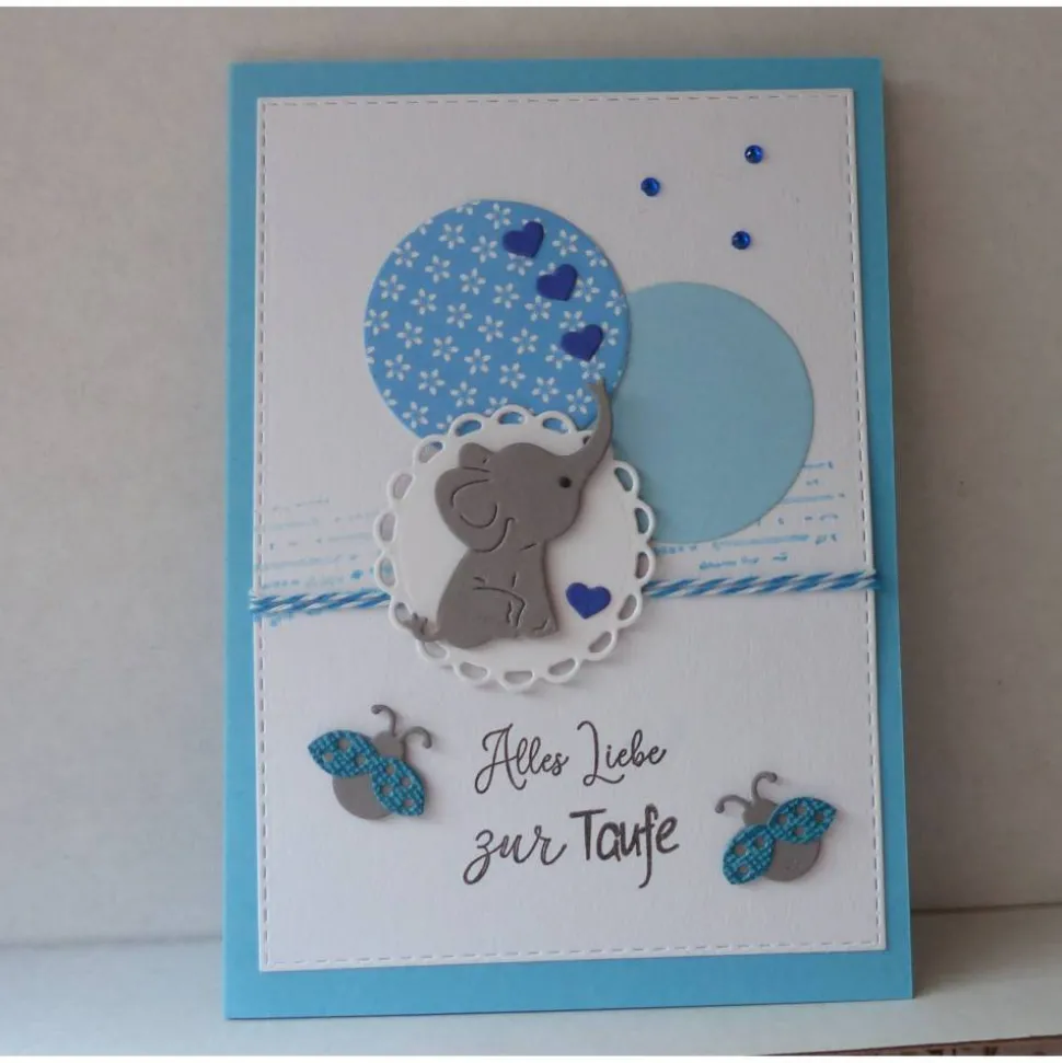 als Deko sind auf der Karte eine Elefant,Kreise,Marienenkäfer kleine Herzen und Schmucksteinchen. und
