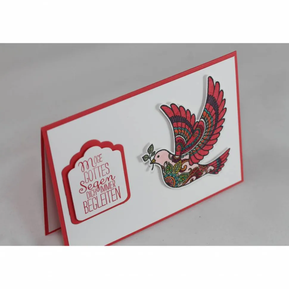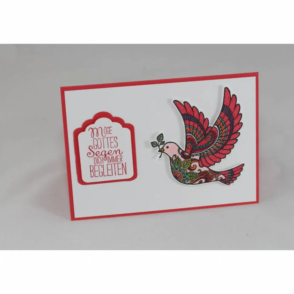 Die Grundkarte ist in einem rötlichen Pink. Darauf klebt ein weißer Aufleger. Diesen zieren ein kleines Schildchen mit dem Glückwunsch, der ebenfalls in diesem rötlichen Pink gemattet wurde. Der Hingucker ist allerdings die Taube, die von mir in verschiedenen Farben wie pink, lila, türkis, rot, rosa, grün und gelb coloriert wurde, ausgeschnitten und mit Abstandklebepads aufgebracht wurde.