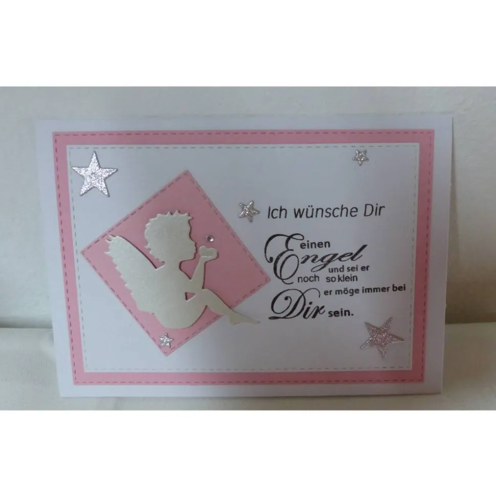 Die harmonische Farbkombination in Blautönen oder Rosatönen verziert mit einem Engel und Sternen auf weißen Untergrund sind ganz bezaubernd.